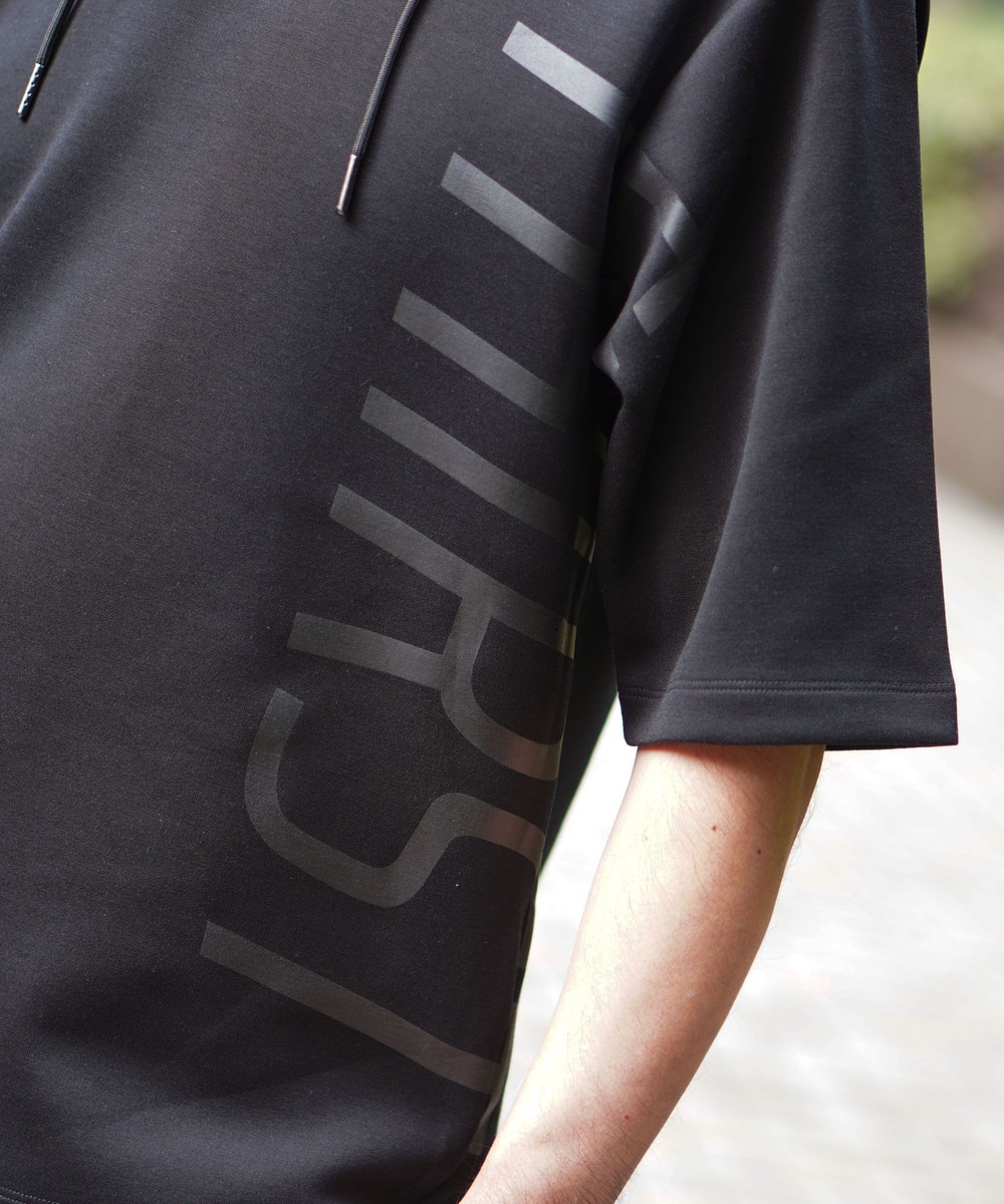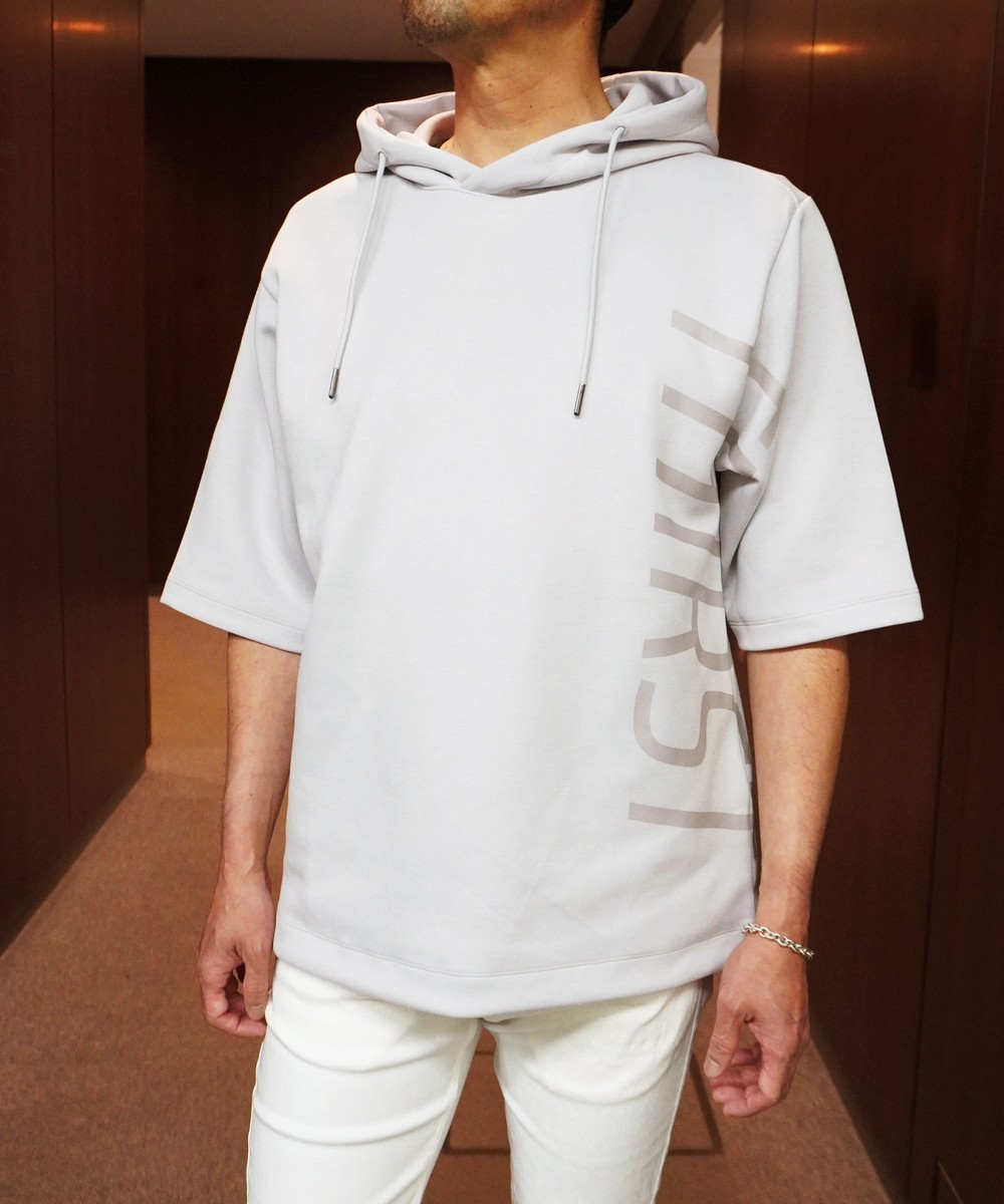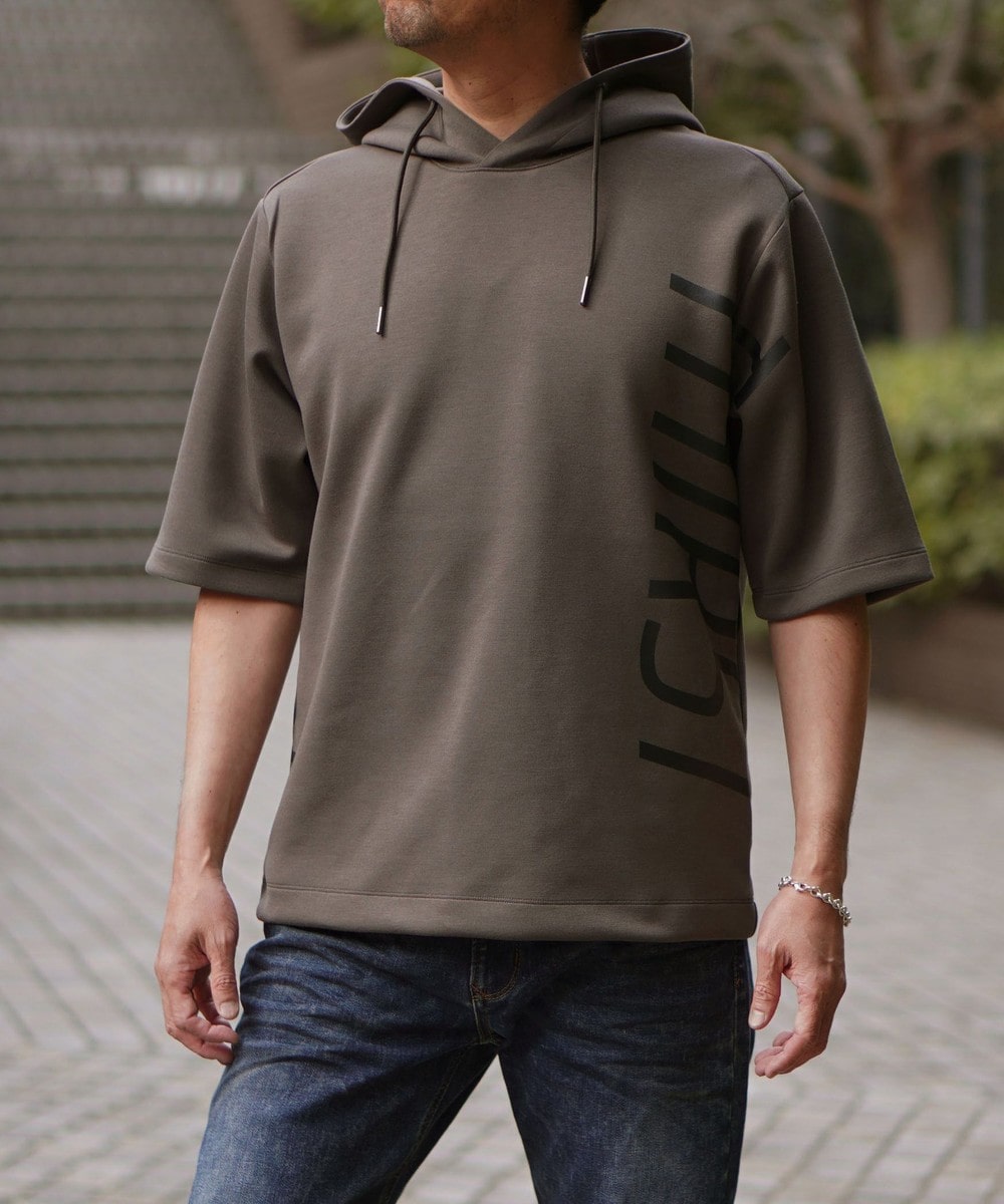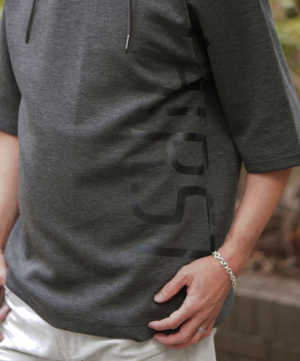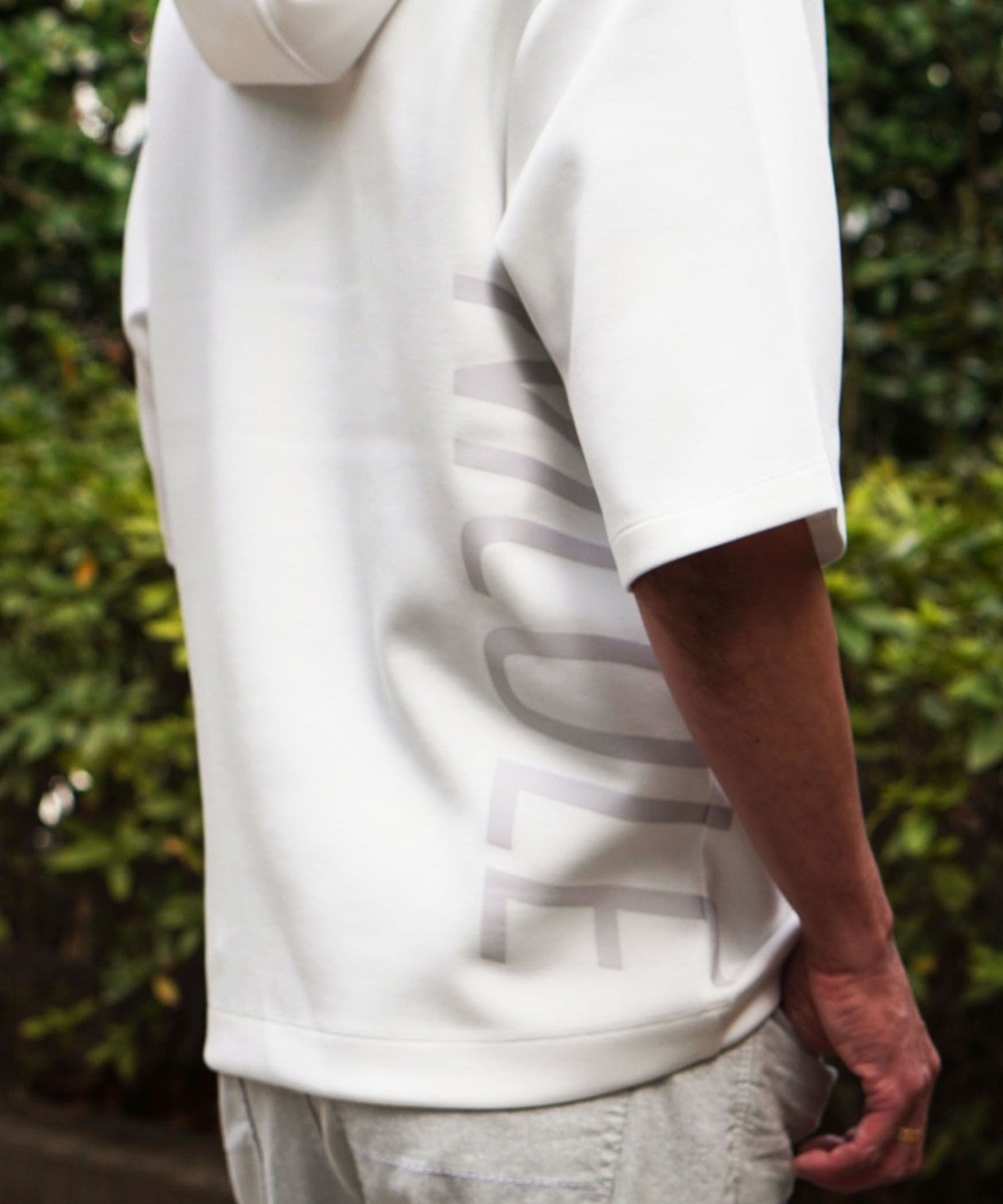 ゆったりとしたシルエットに左右脇を跨ぐプリントが目を引く5分袖フーデットパーカー。羽織のインナーとしても1枚で着ても様になるアイテムとなっています。