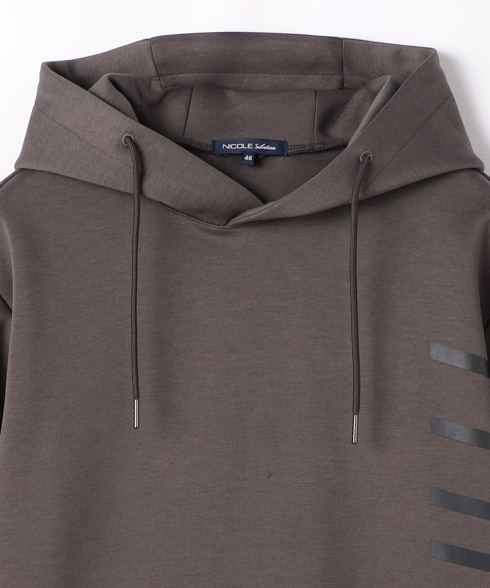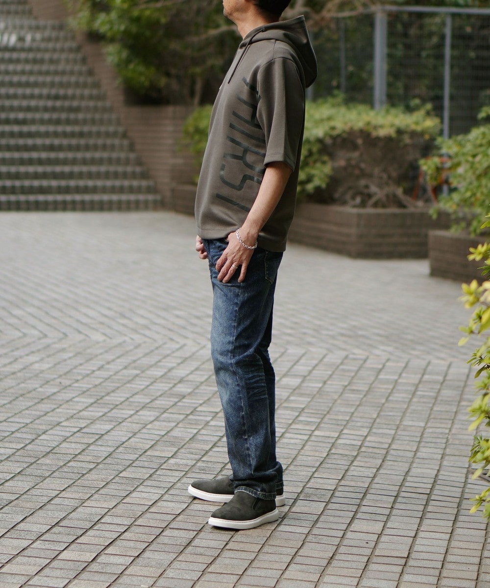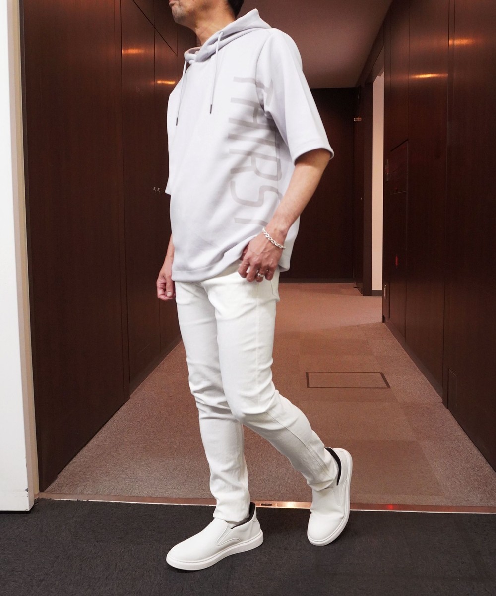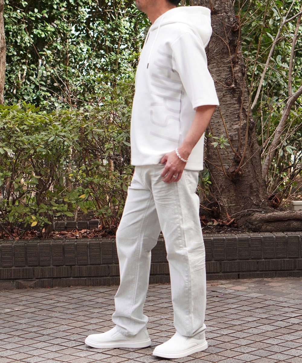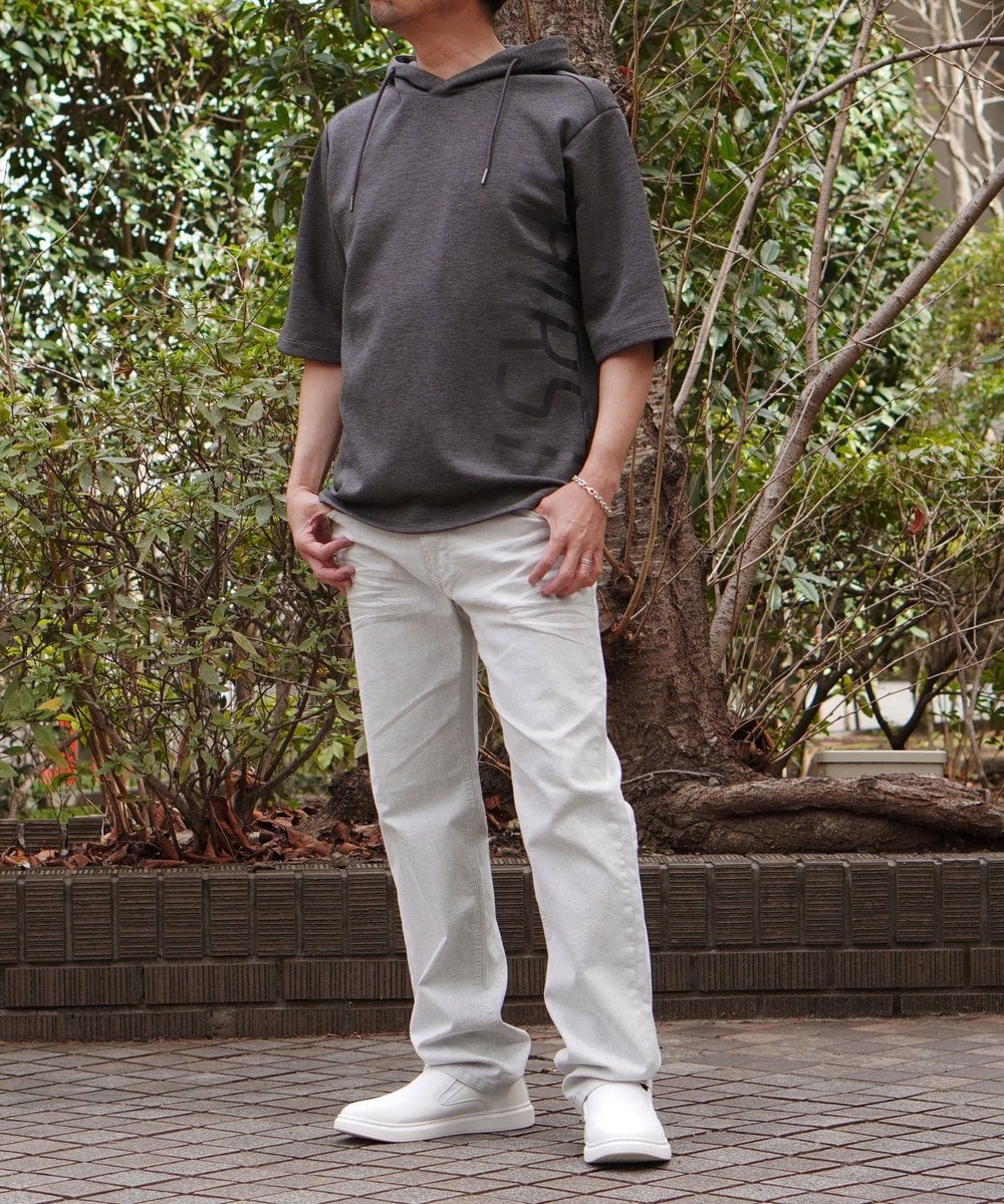 ゆったりとしたシルエットに左右脇を跨ぐプリントが目を引く5分袖フーデットパーカー。羽織のインナーとしても1枚で着ても様になるアイテムとなっています。