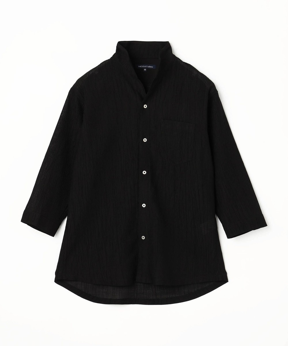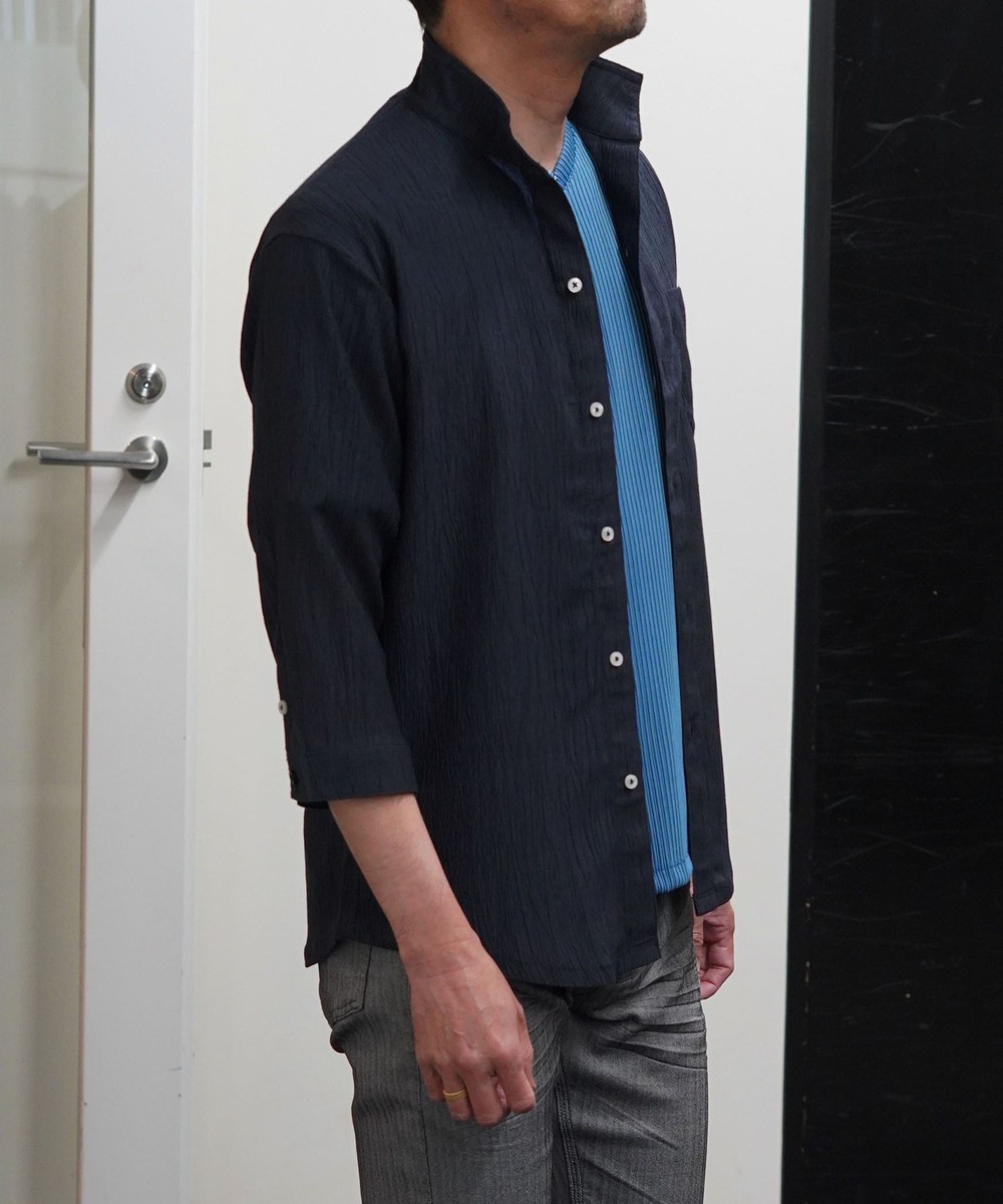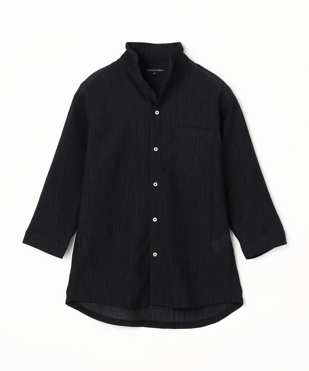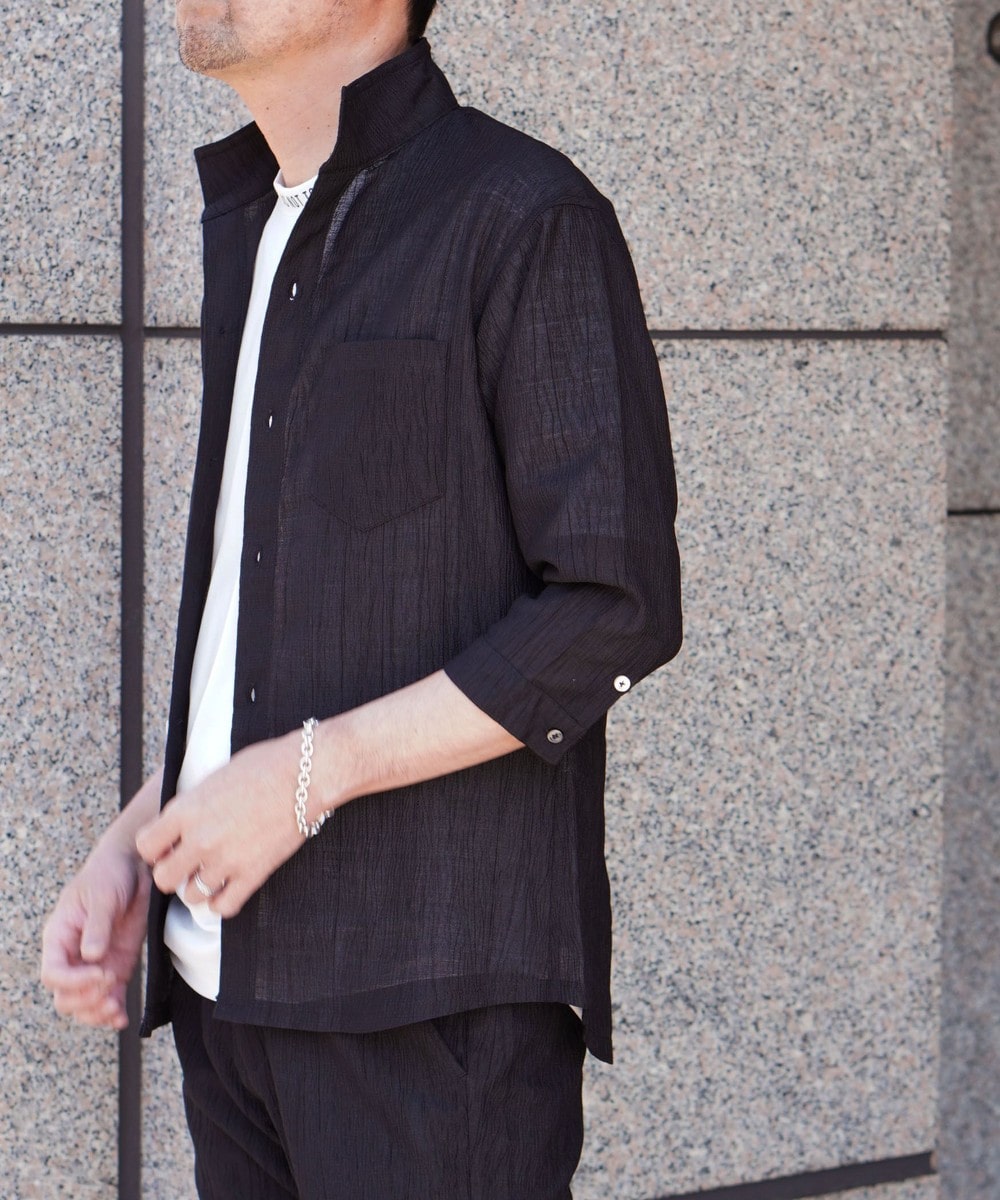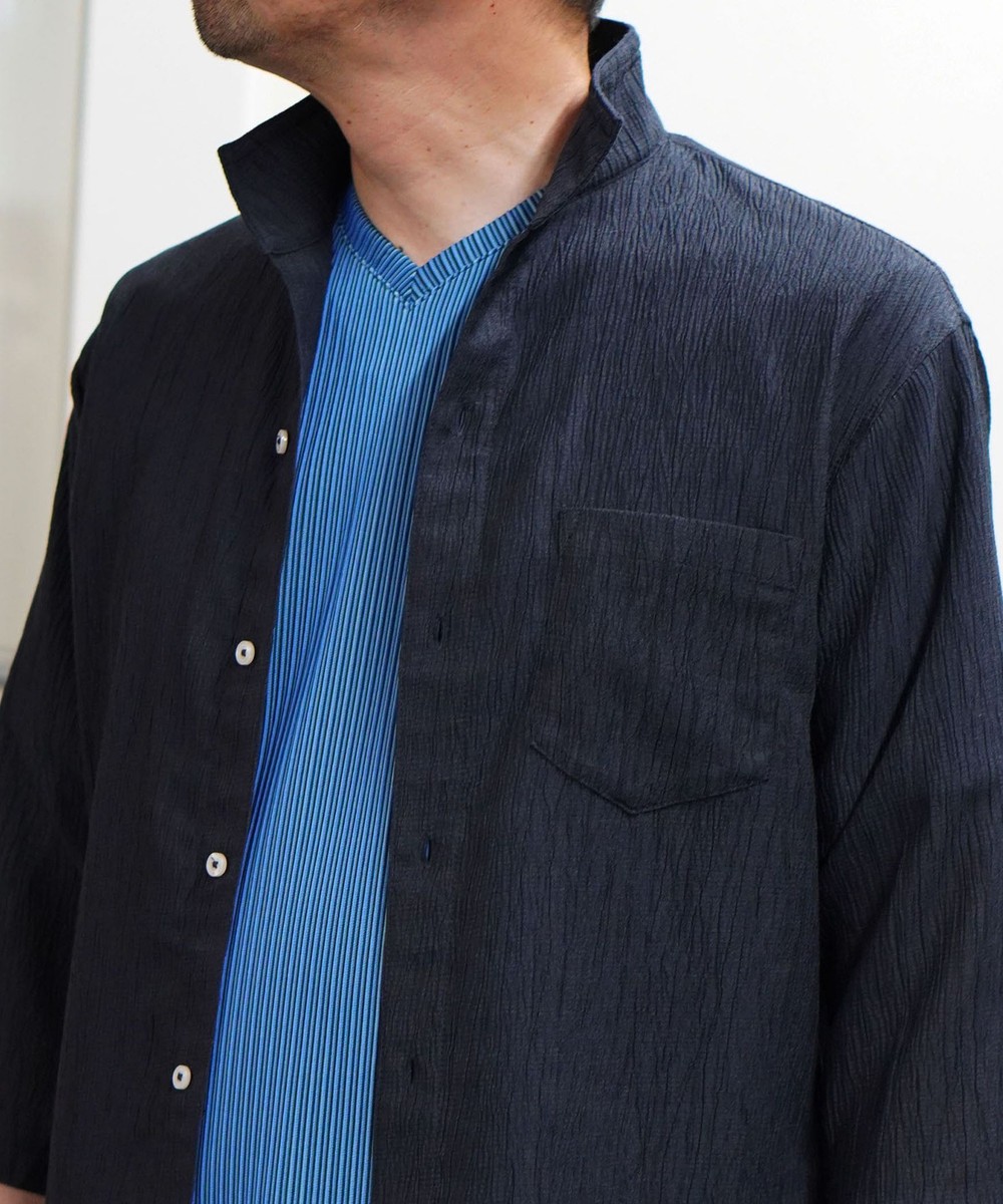 衿端にワイヤ-を仕込んだ七分丈ショートスタンドカラ-シャツ。衿端にワイヤーを入れることで襟を寝かせたり立てたりすることでスタイリングの幅を広げられるデザインとなっています。