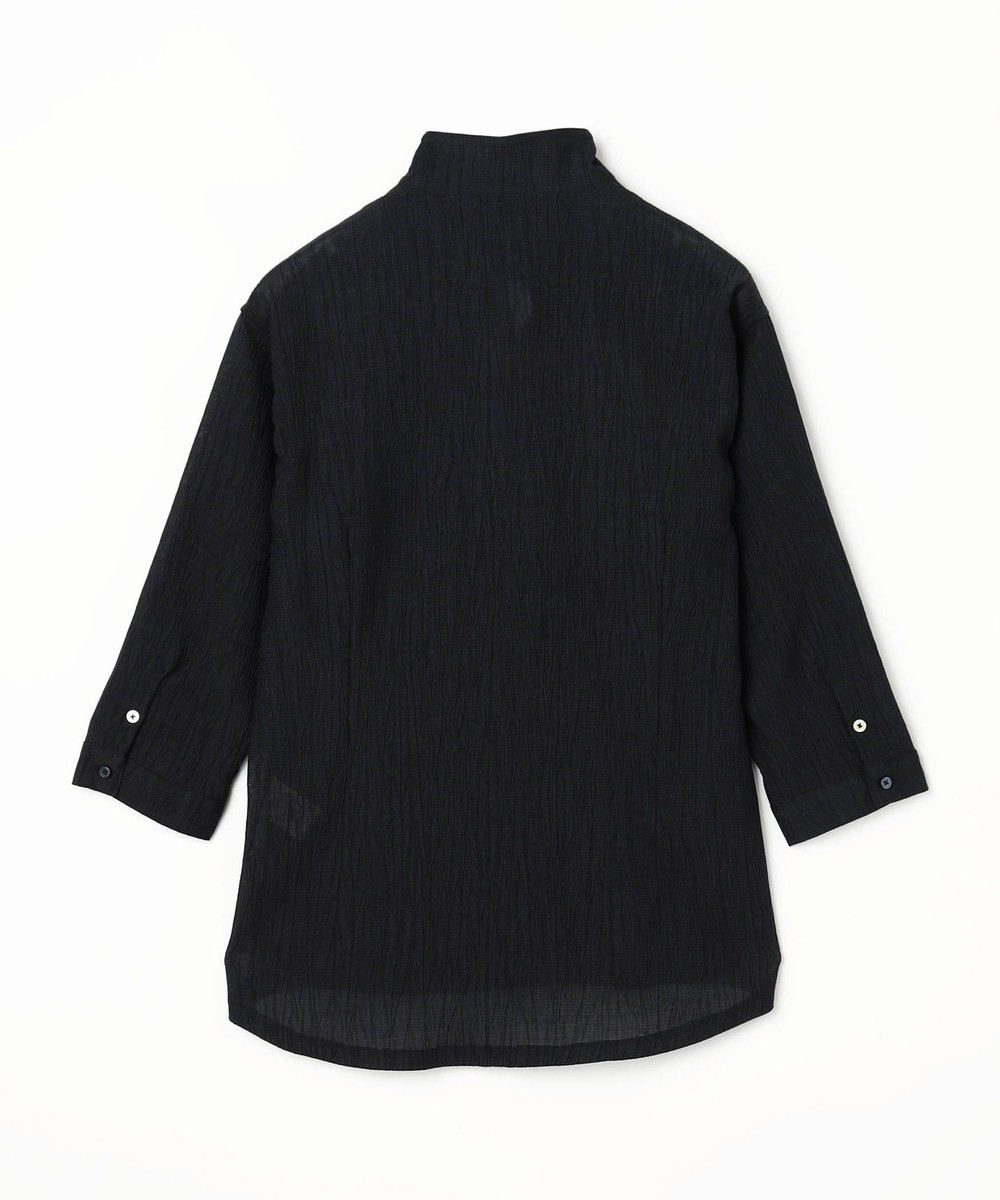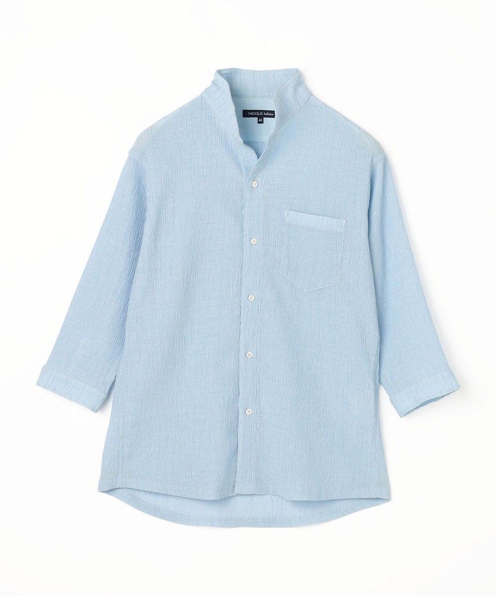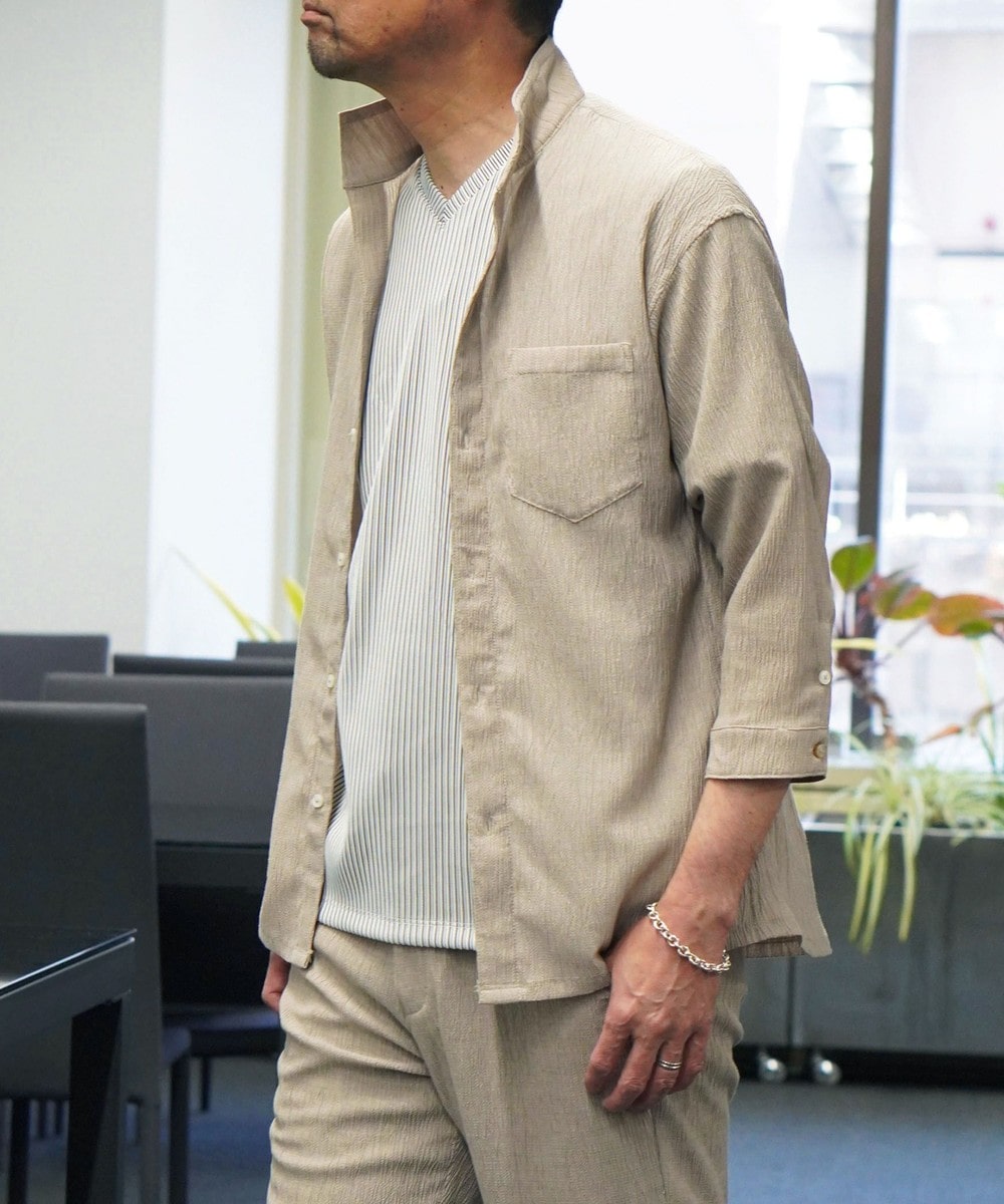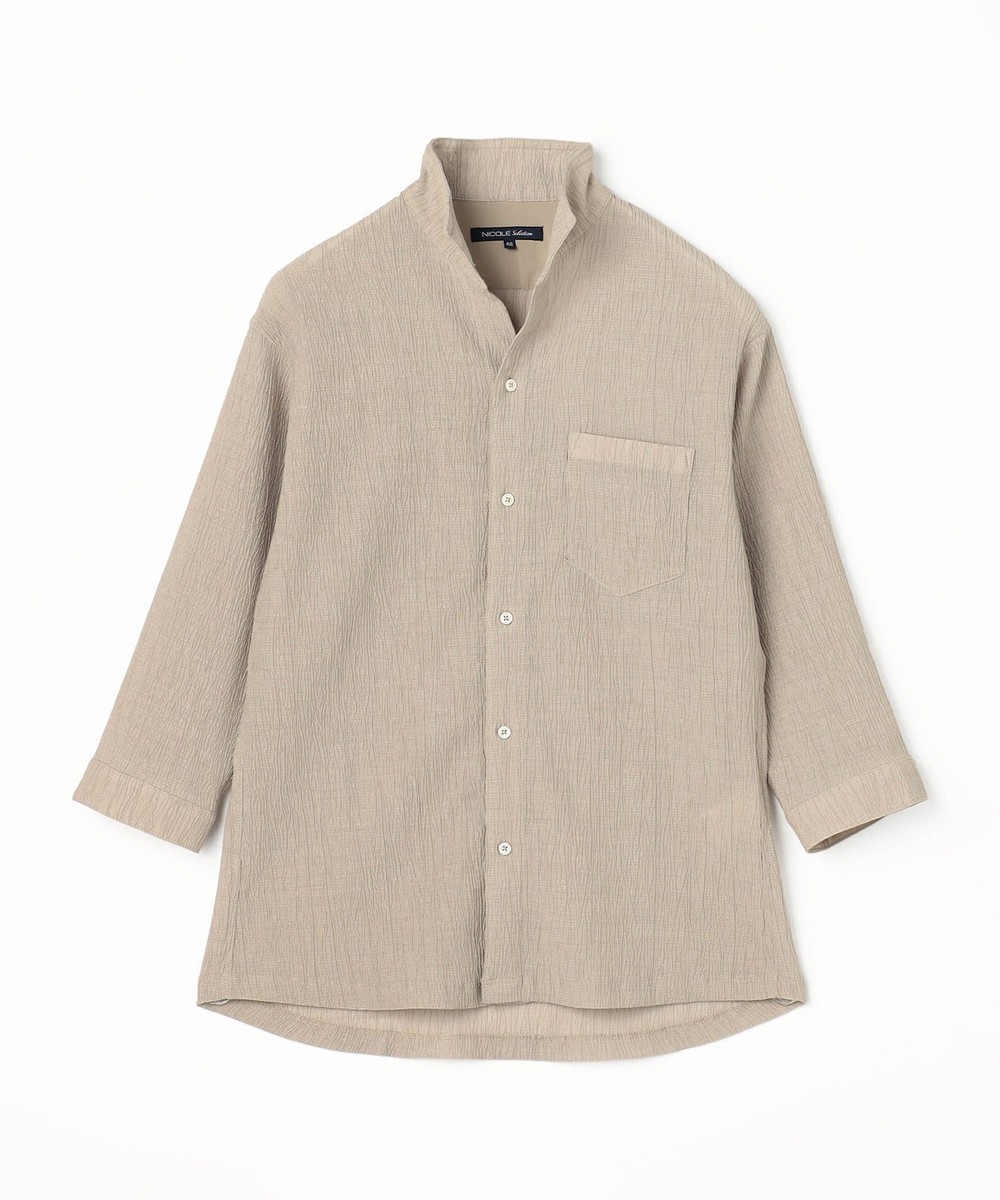 衿端にワイヤ-を仕込んだ七分丈ショートスタンドカラ-シャツ。衿端にワイヤーを入れることで襟を寝かせたり立てたりすることでスタイリングの幅を広げられるデザインとなっています。