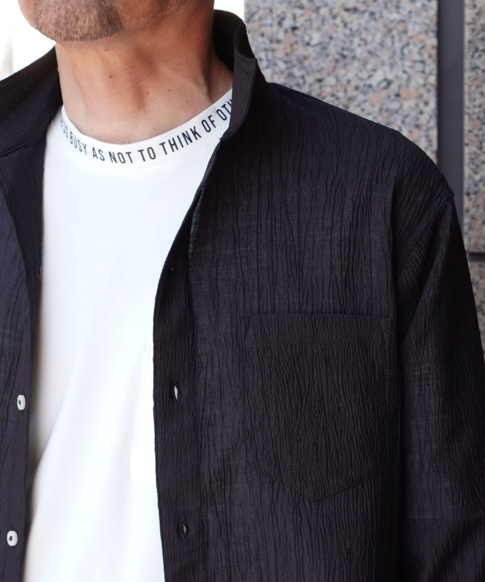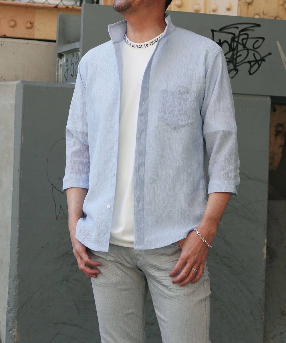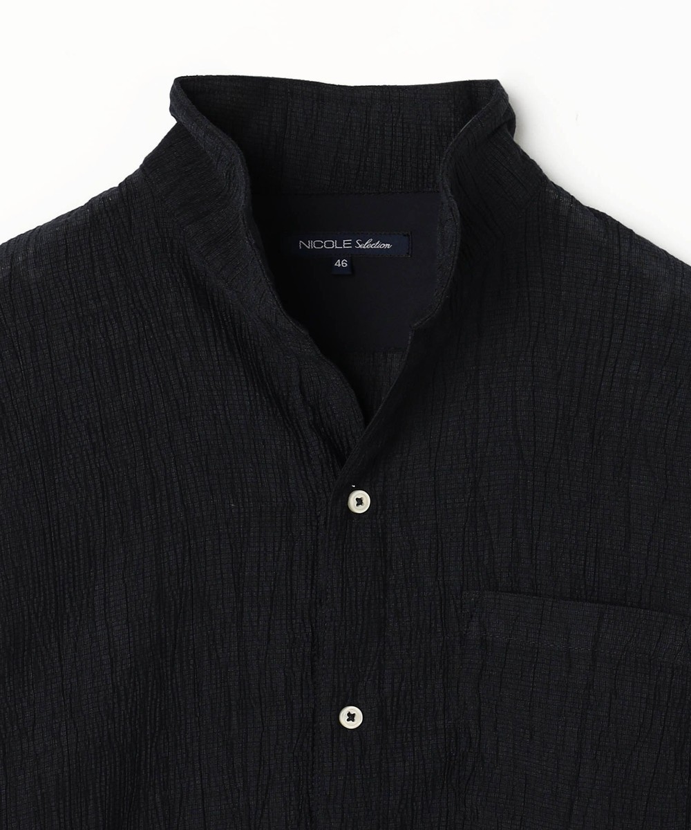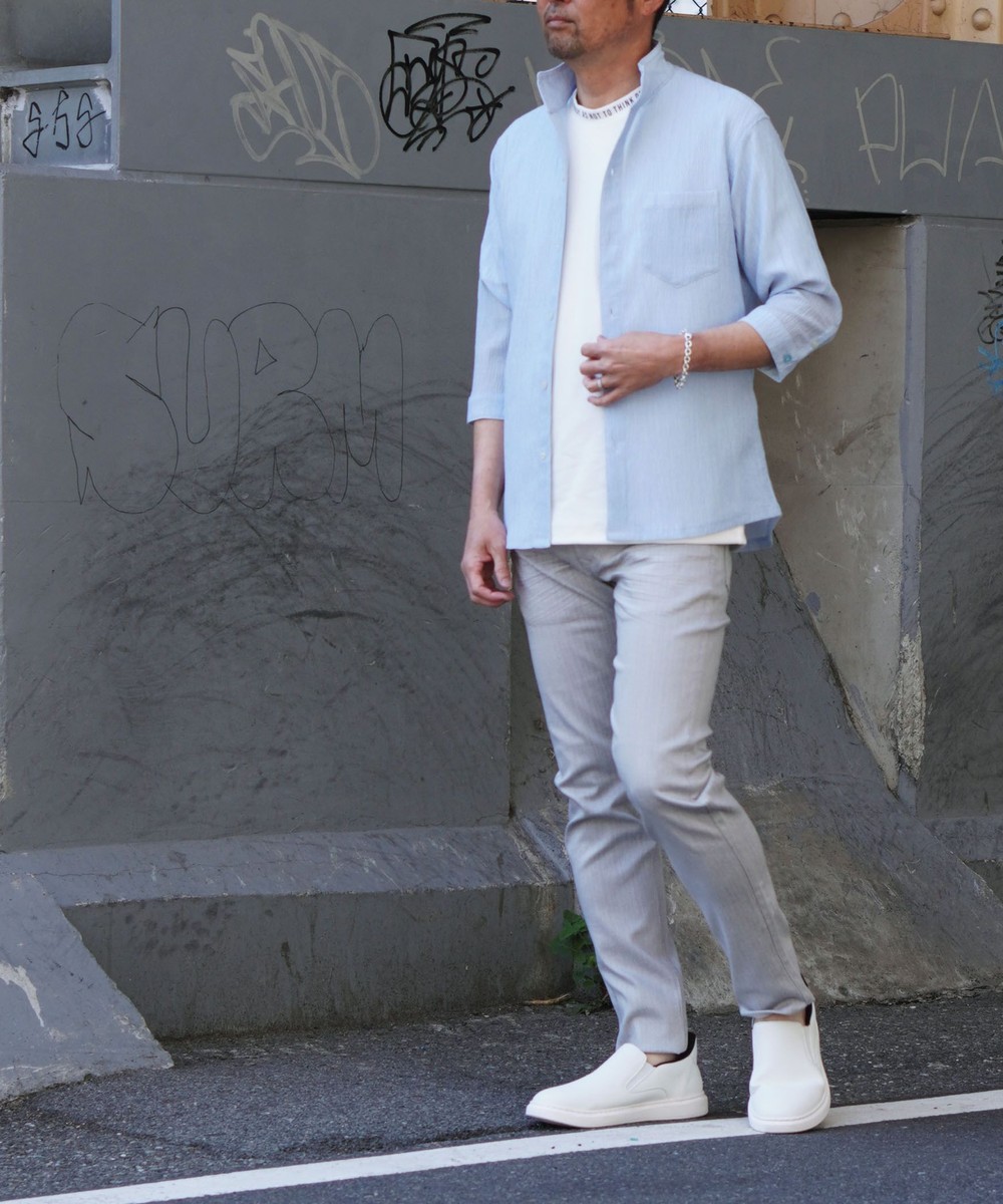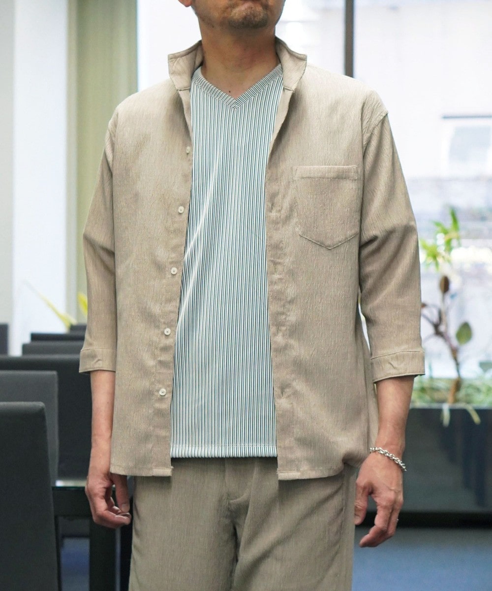 衿端にワイヤ-を仕込んだ七分丈ショートスタンドカラ-シャツ。衿端にワイヤーを入れることで襟を寝かせたり立てたりすることでスタイリングの幅を広げられるデザインとなっています。