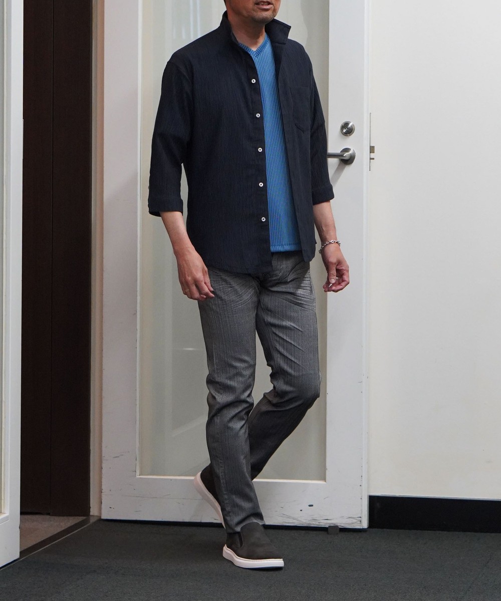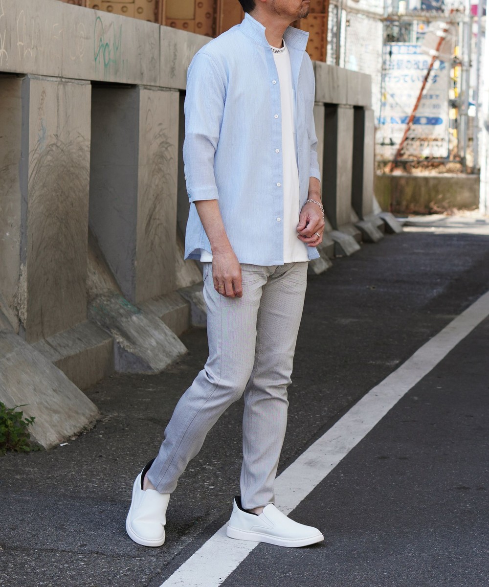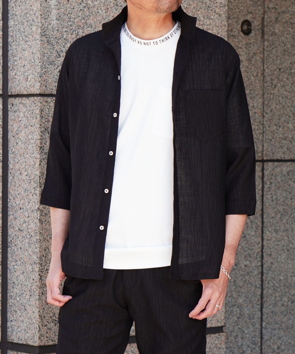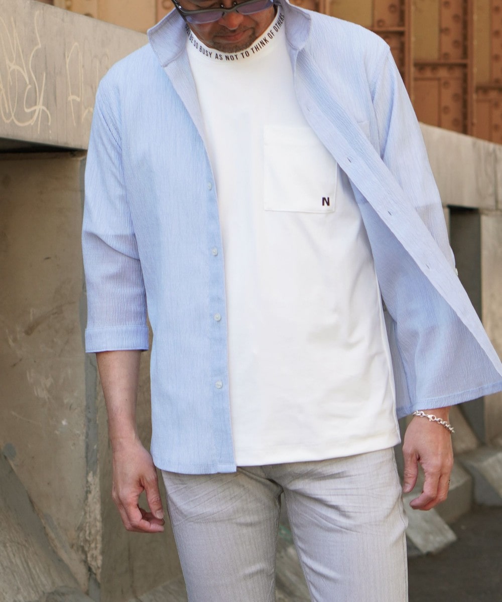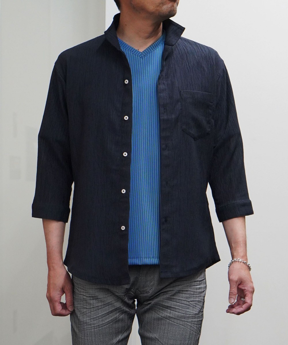 衿端にワイヤ-を仕込んだ七分丈ショートスタンドカラ-シャツ。衿端にワイヤーを入れることで襟を寝かせたり立てたりすることでスタイリングの幅を広げられるデザインとなっています。