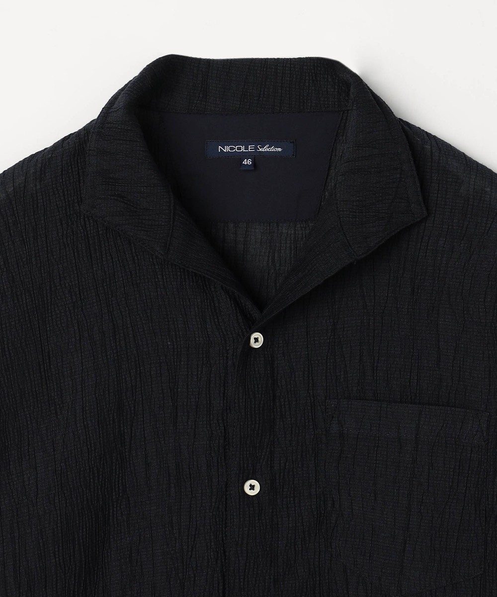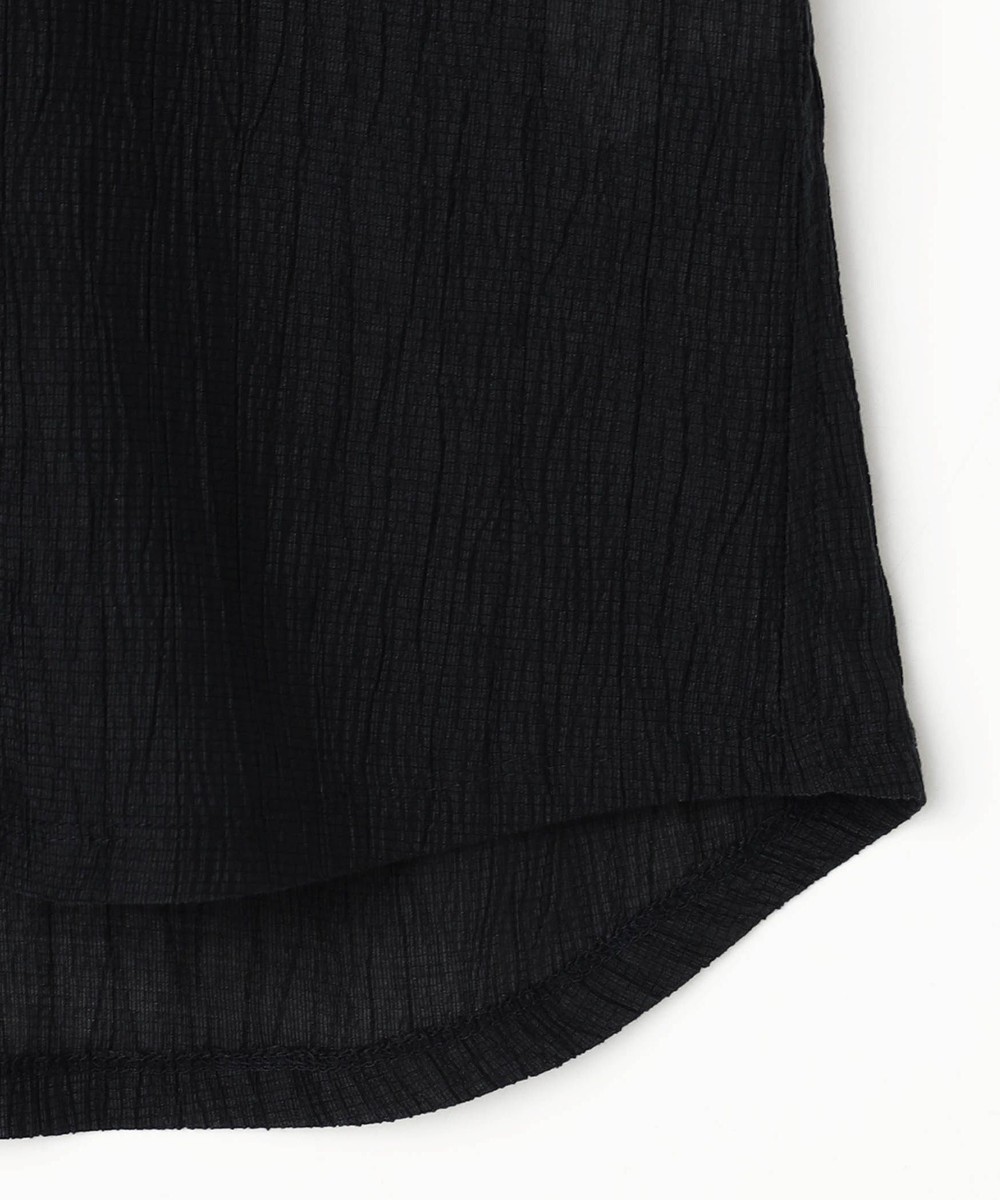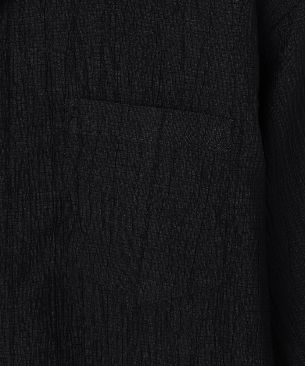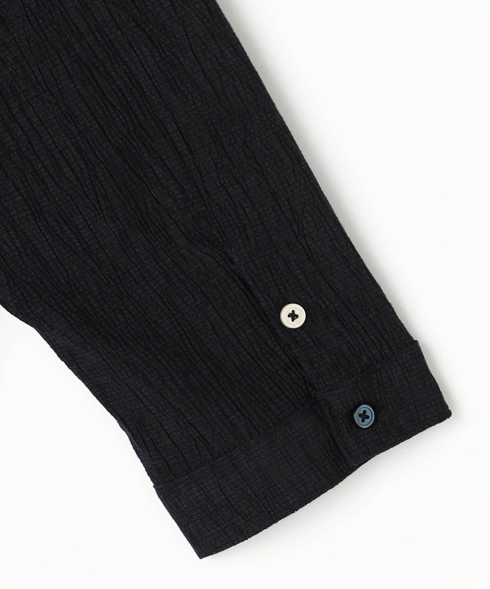 薄いポリエステル素材に楊柳の様な細かいプリーツ加工を施した素材です。生地自体のシャリっとサラッとしたドライな風合いは肌離れが良くシワになりづらいイージーケア性が特徴ですので春先~晩夏まで、長い期間着られる素材となっています。