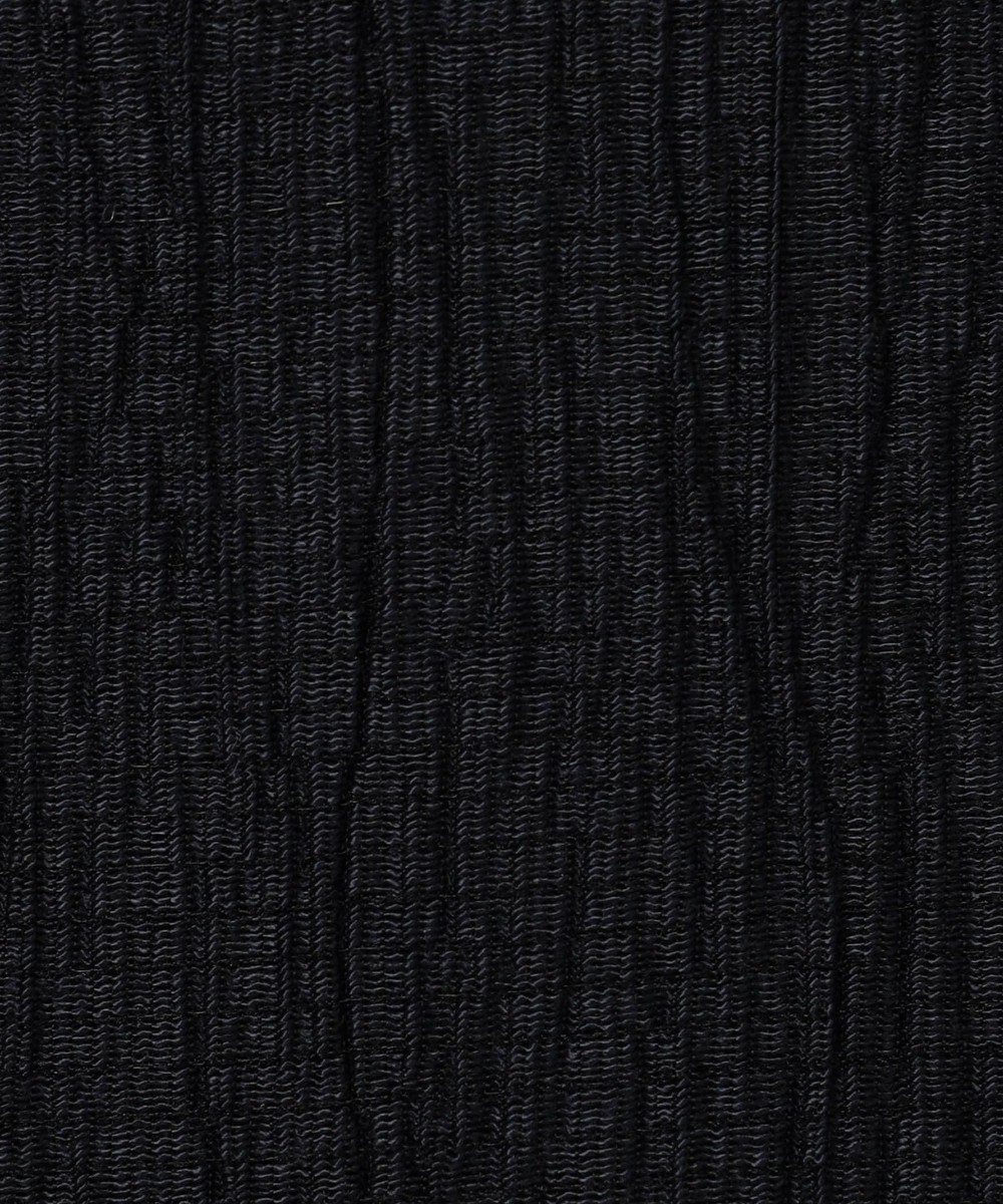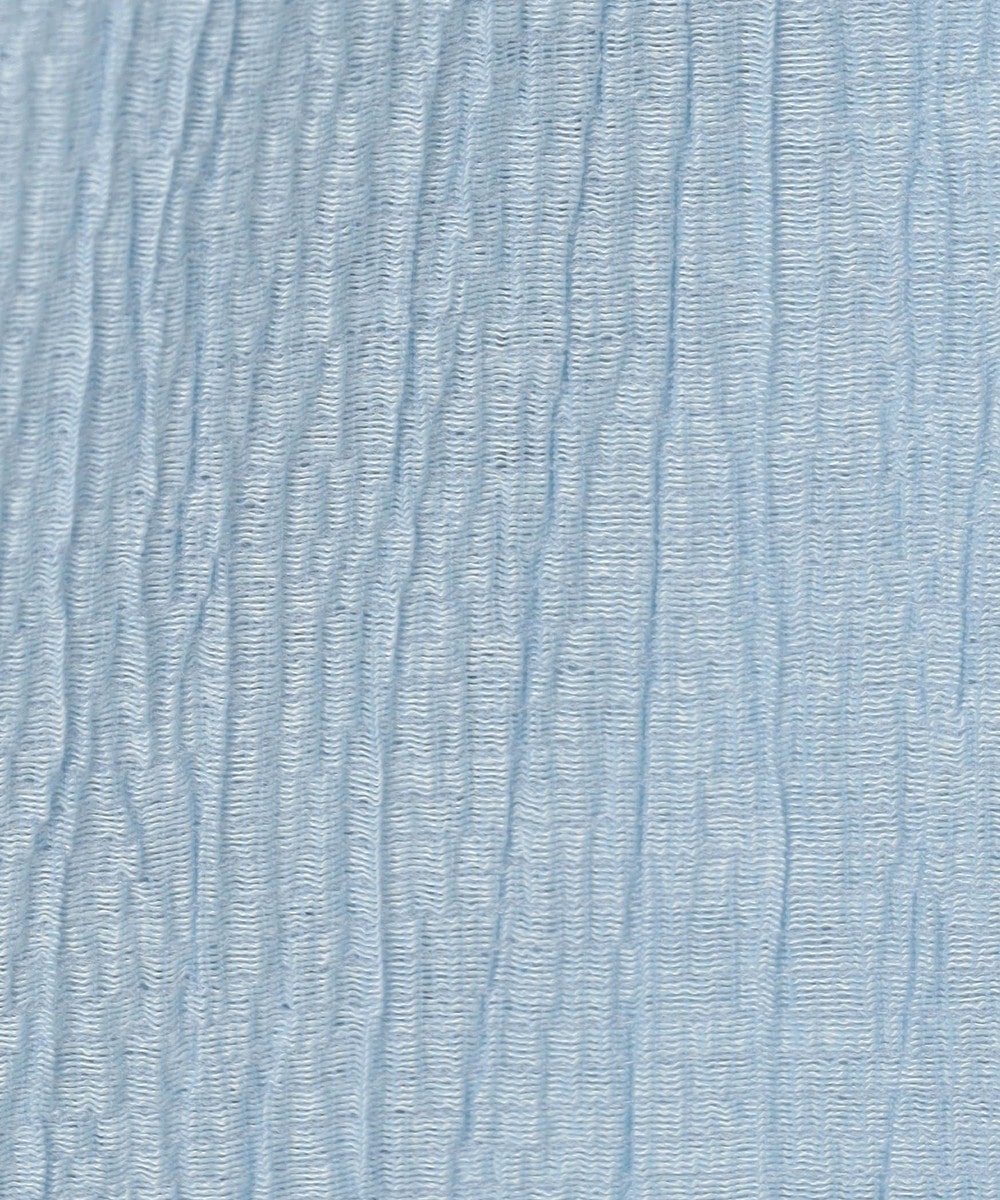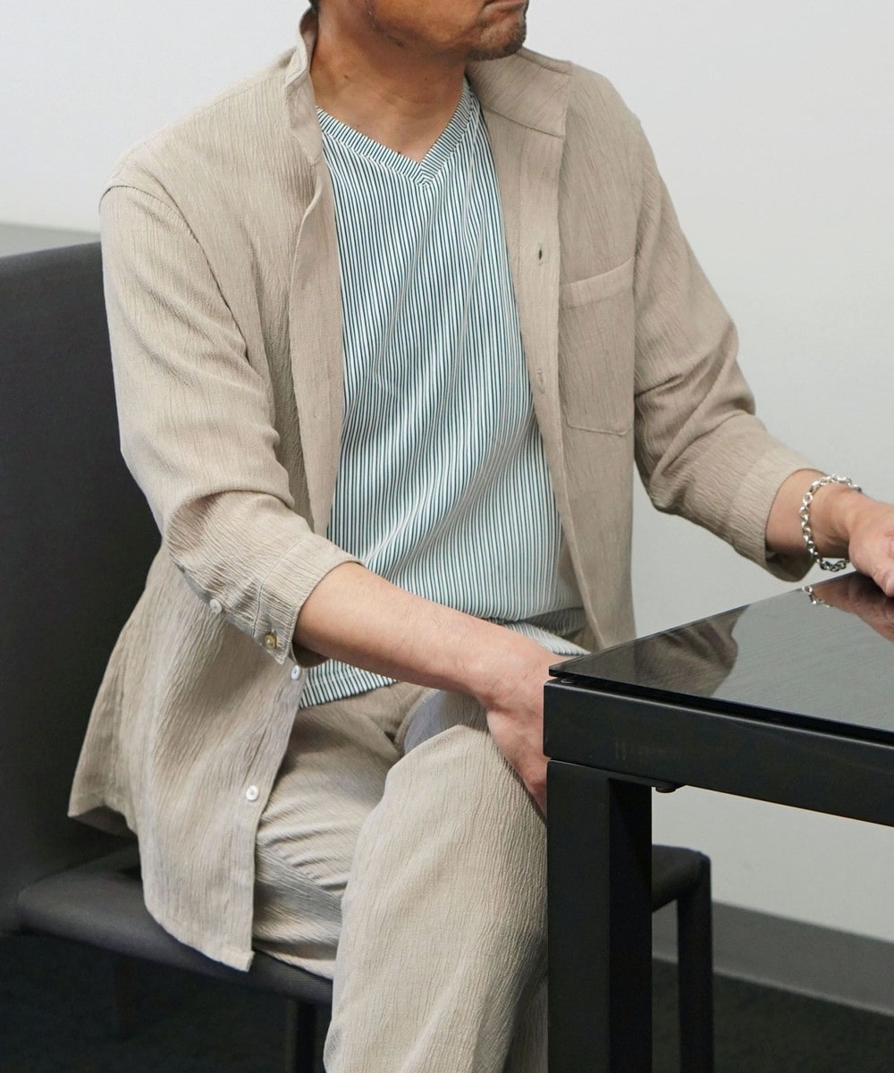 薄いポリエステル素材に楊柳の様な細かいプリーツ加工を施した素材です。生地自体のシャリっとサラッとしたドライな風合いは肌離れが良くシワになりづらいイージーケア性が特徴ですので春先~晩夏まで、長い期間着られる素材となっています。