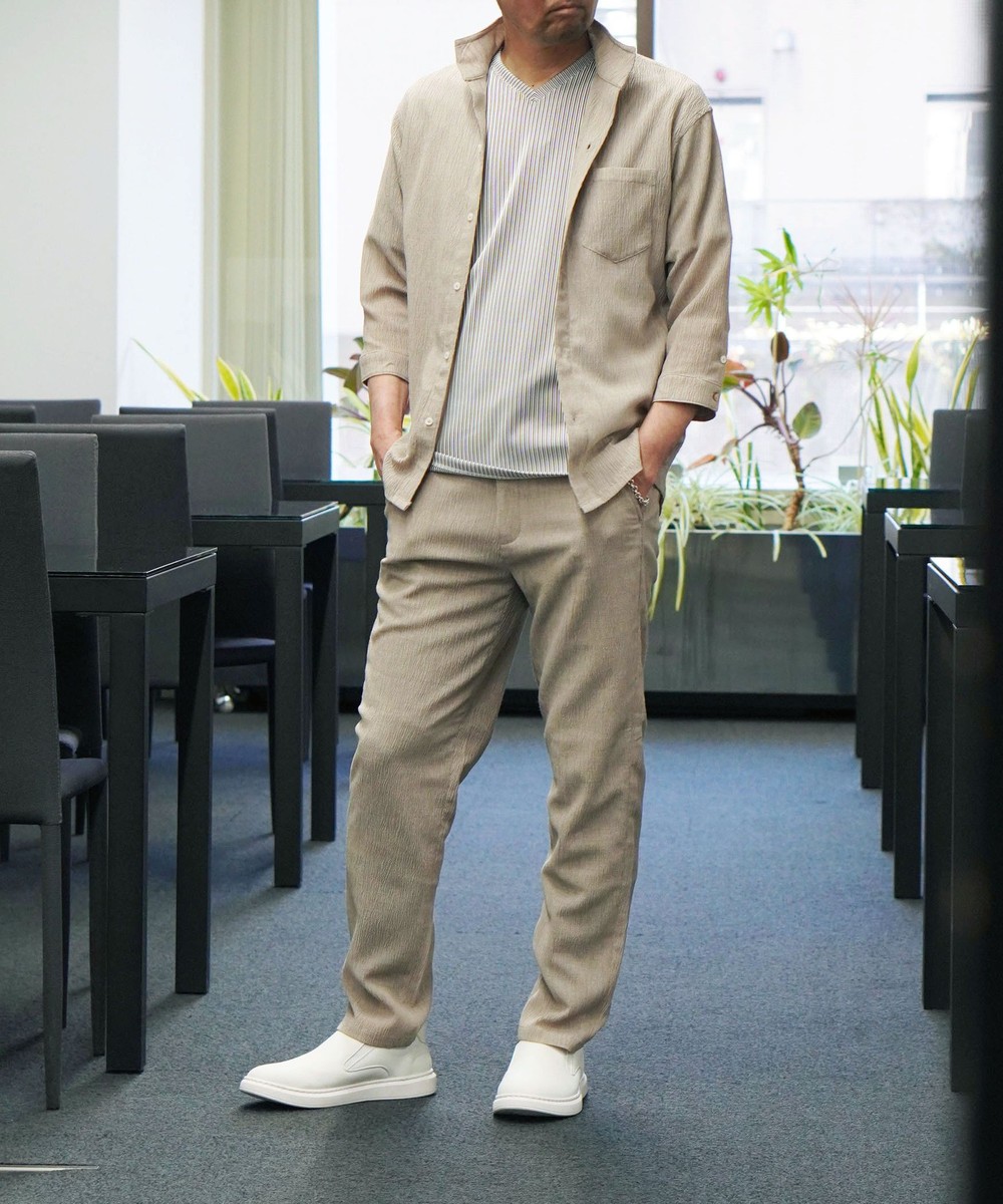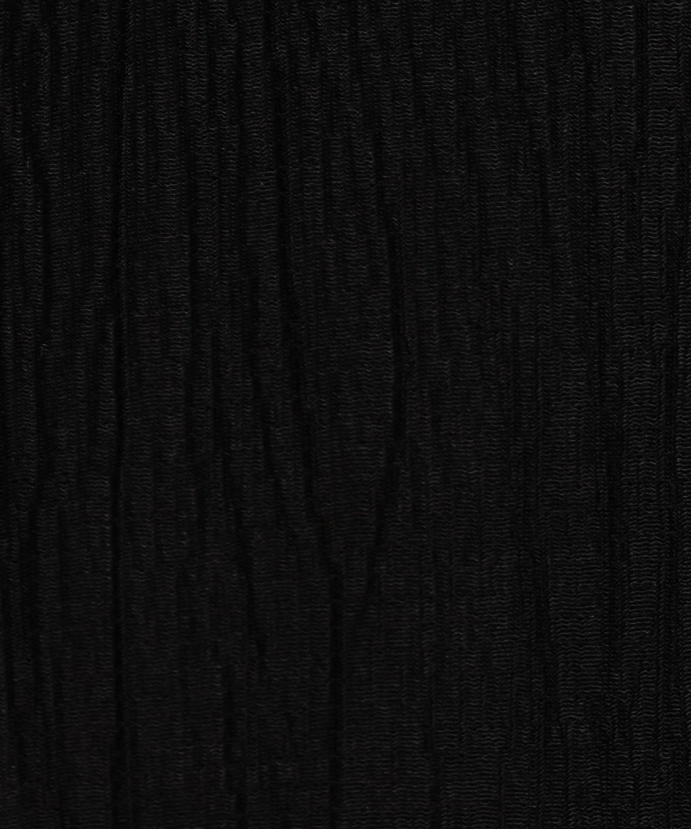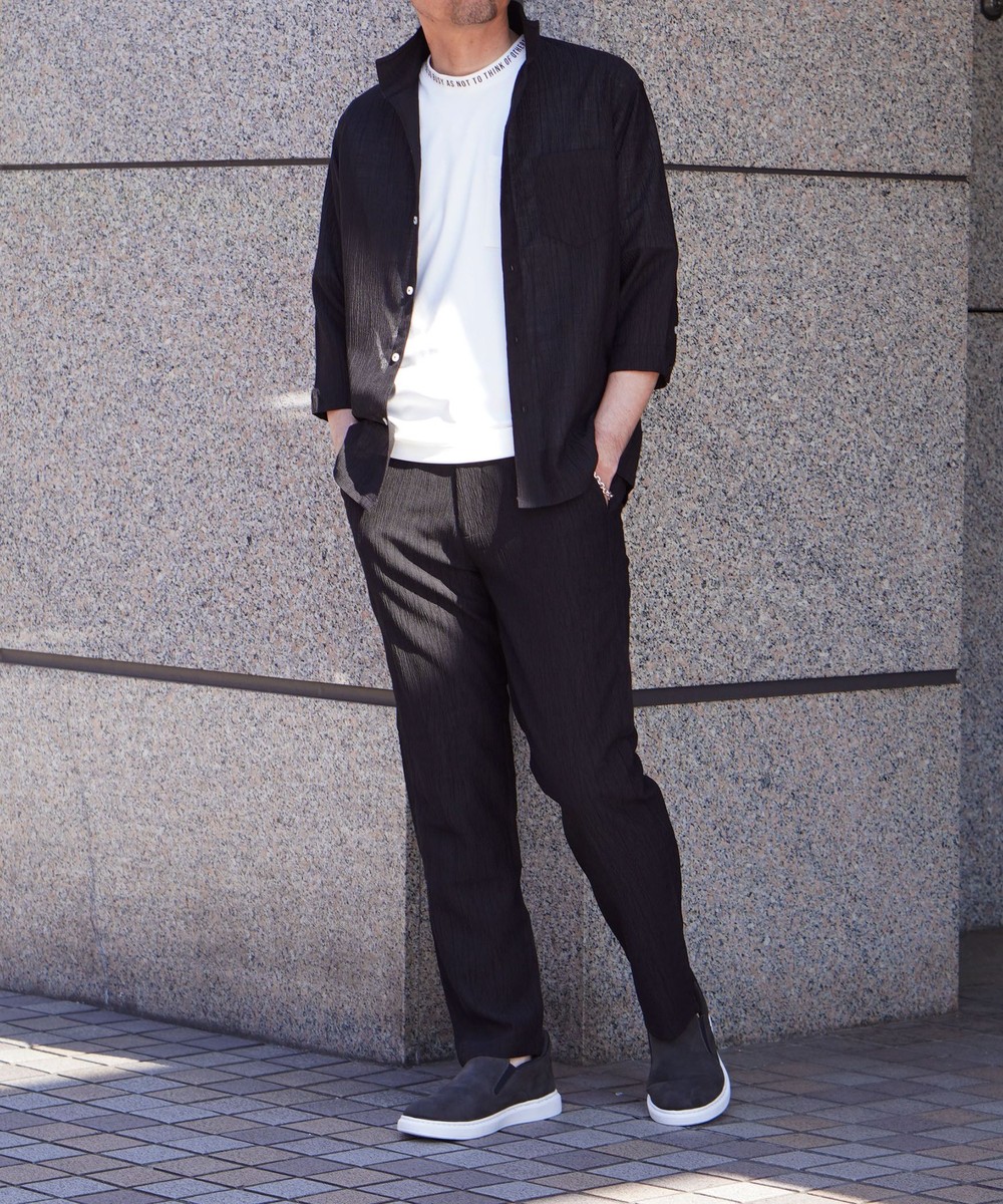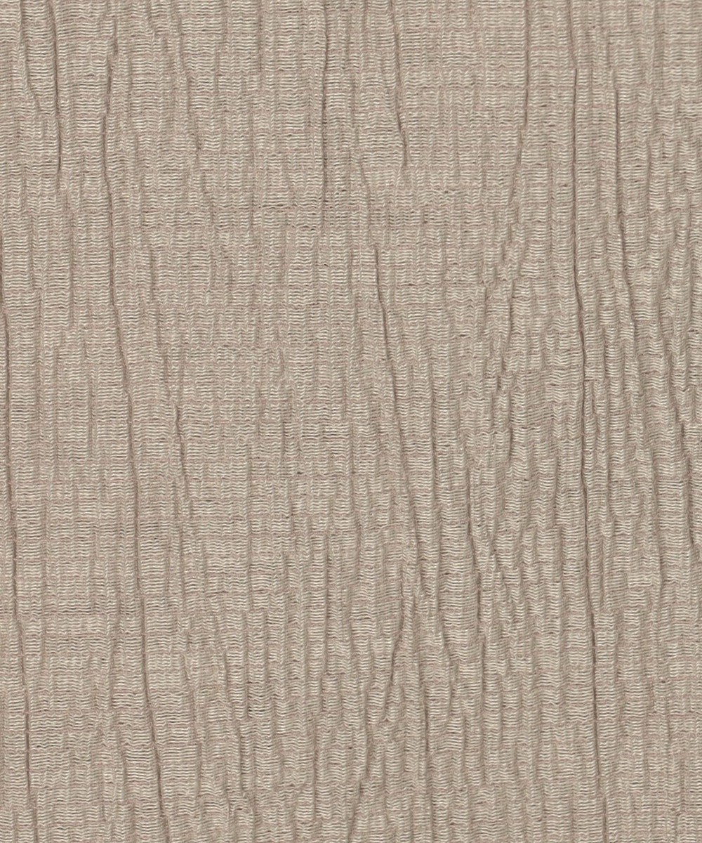 薄いポリエステル素材に楊柳の様な細かいプリーツ加工を施した素材です。生地自体のシャリっとサラッとしたドライな風合いは肌離れが良くシワになりづらいイージーケア性が特徴ですので春先~晩夏まで、長い期間着られる素材となっています。