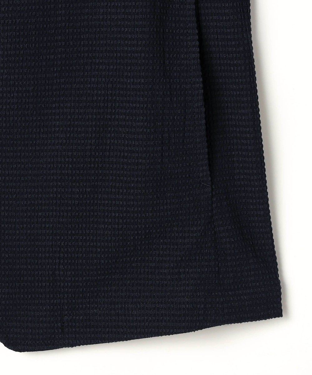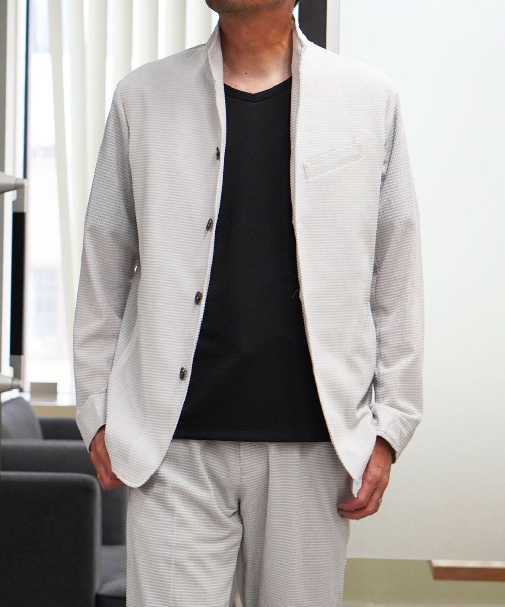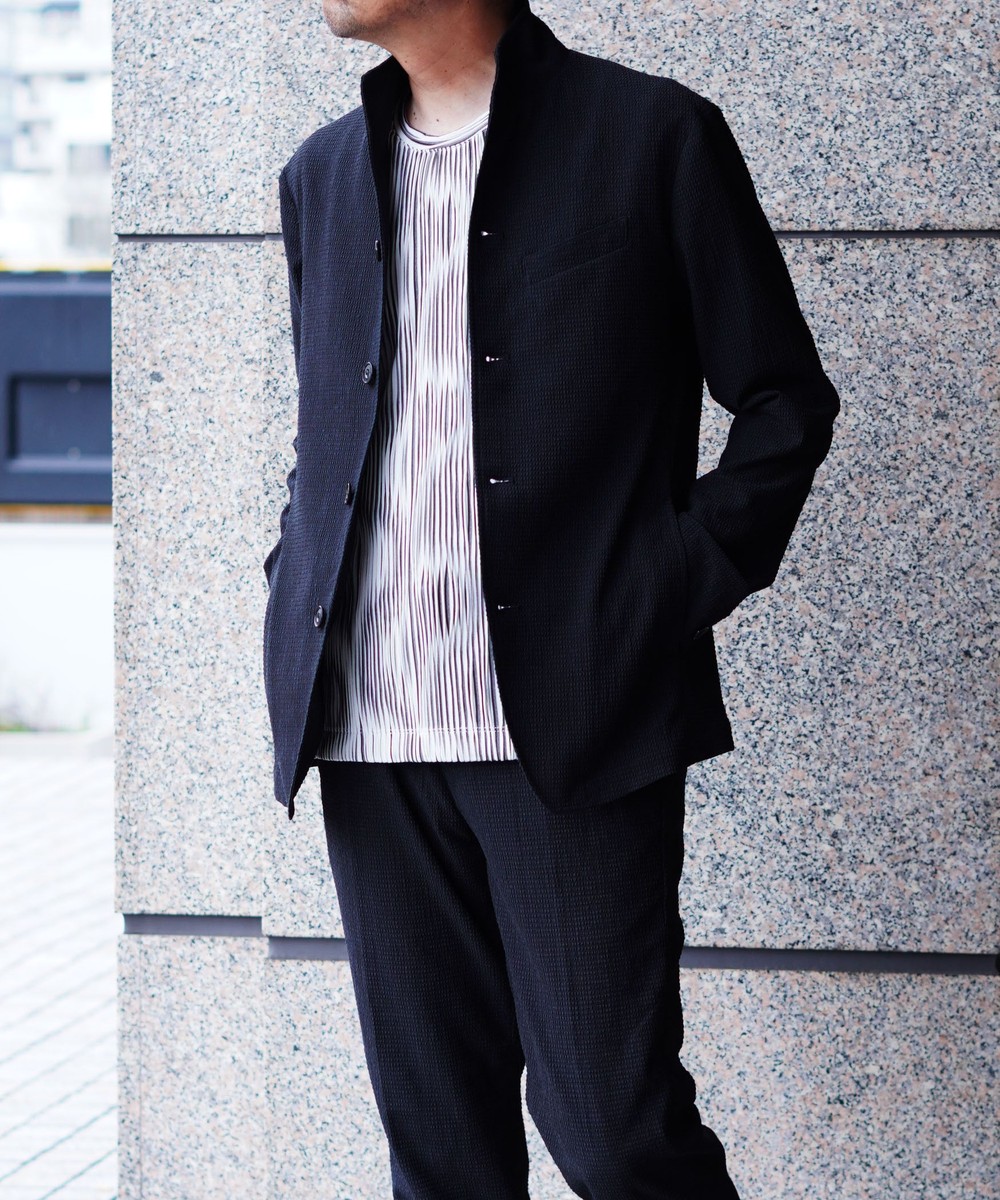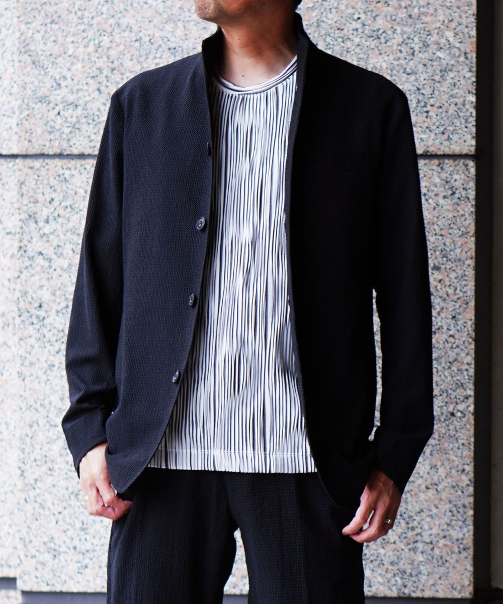 薄いポリエステル素材に楊柳の様な細かいプリーツ加工を施した素材です。生地自体のシャリっとサラッとしたドライな風合いは肌離れが良くシワになりづらいイージーケア性が特徴ですので春先~晩夏まで、長い期間着られる素材となっています。