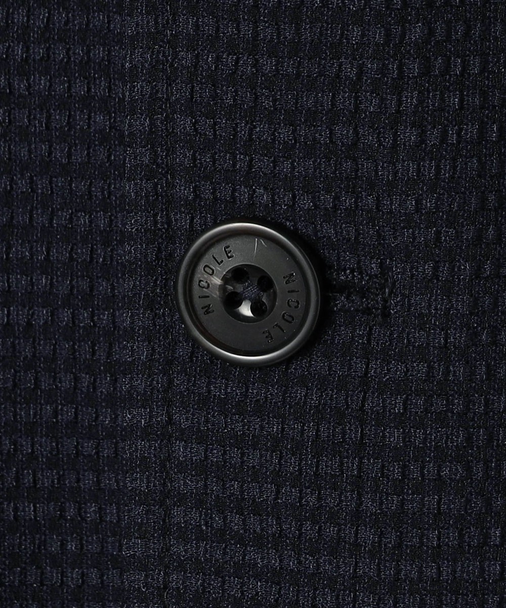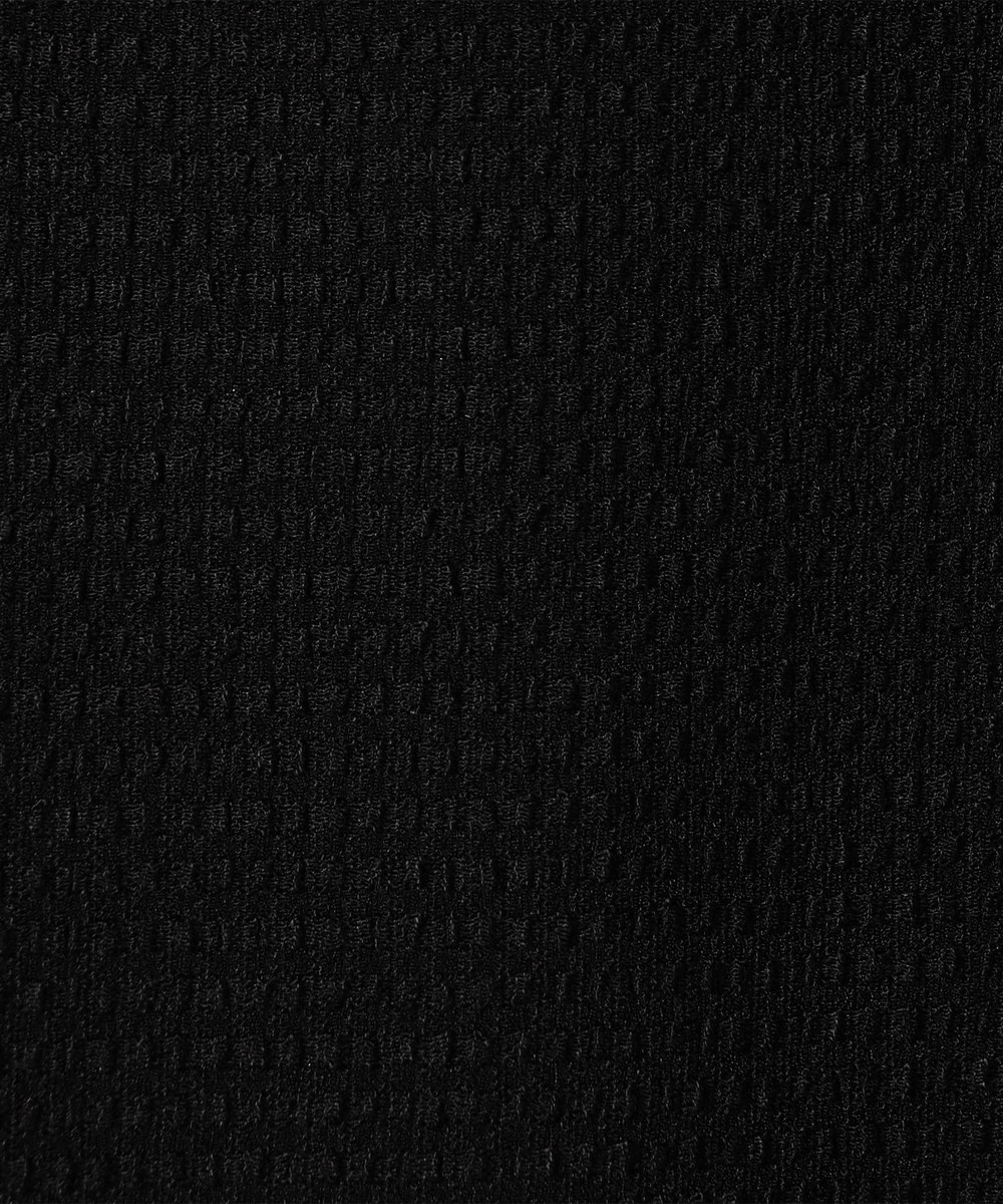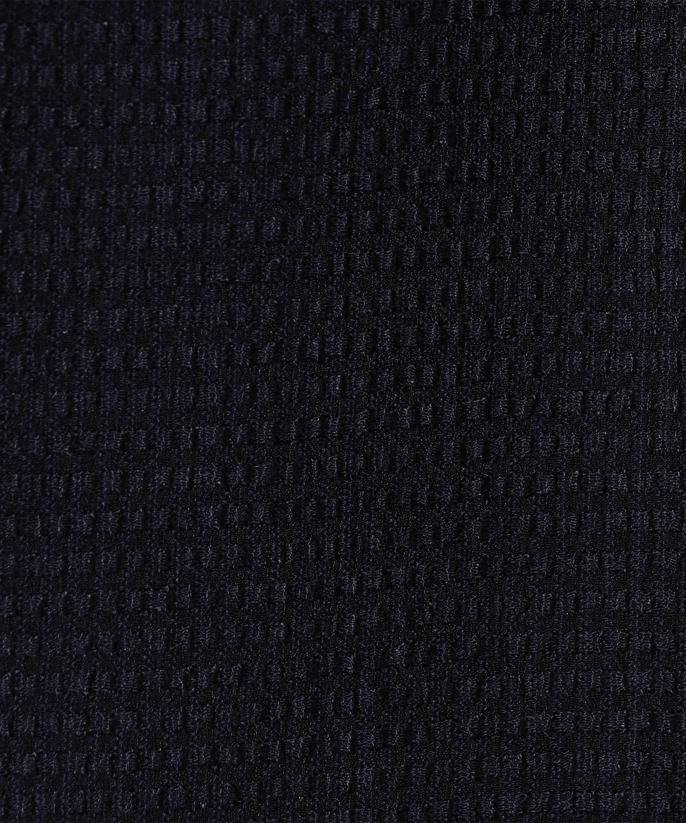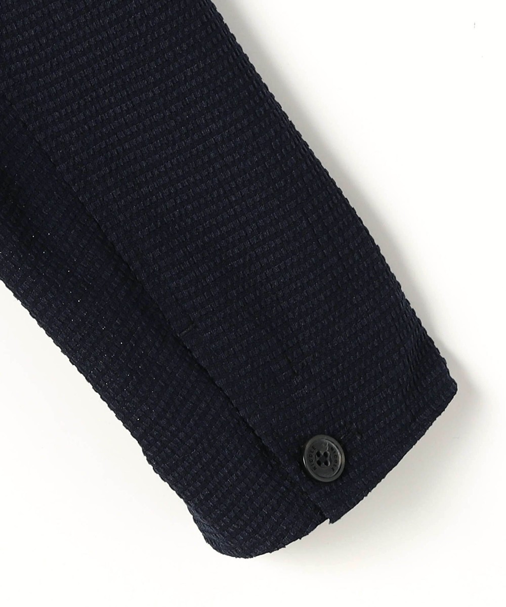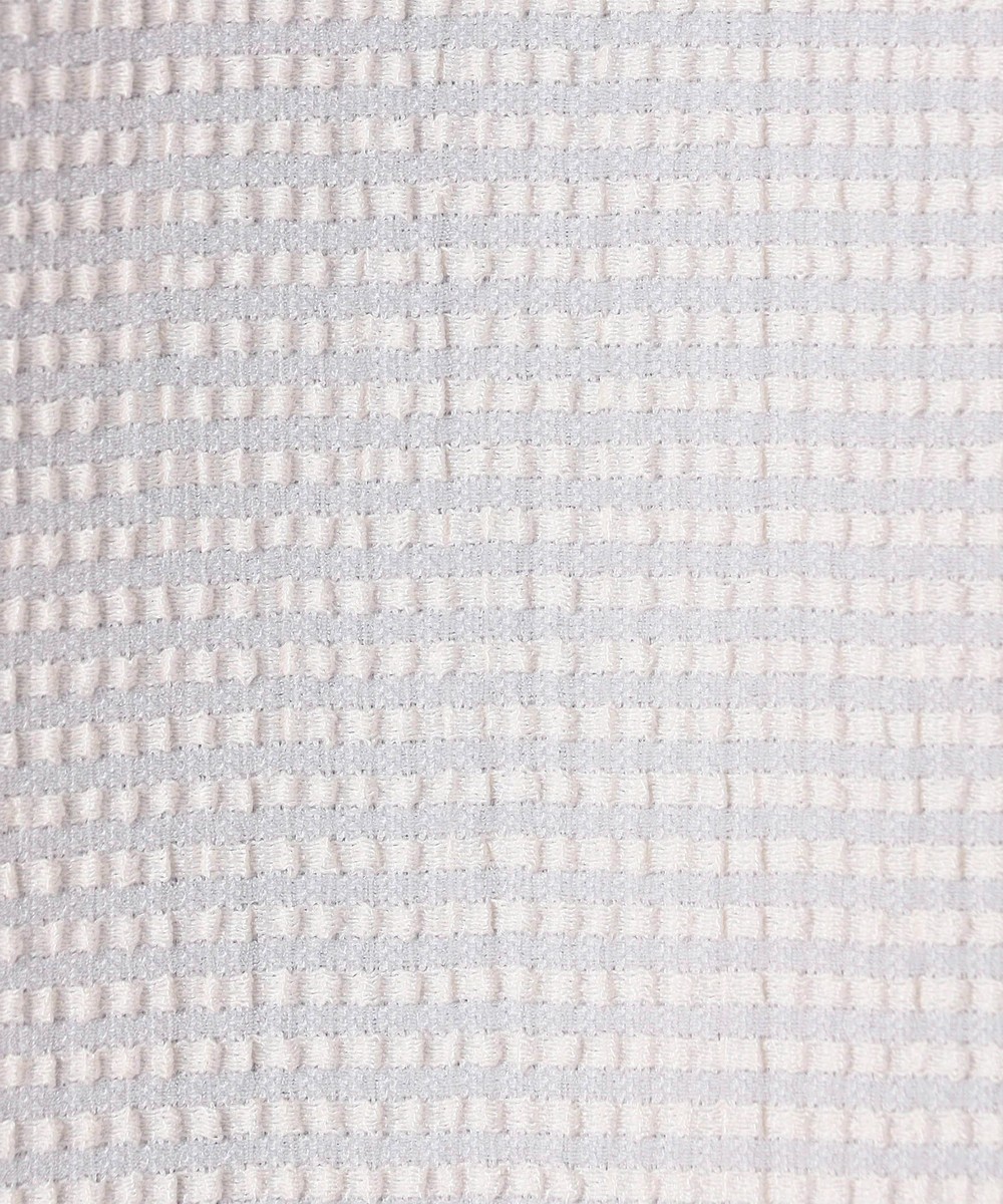薄いポリエステル素材に楊柳の様な細かいプリーツ加工を施した素材です。生地自体のシャリっとサラッとしたドライな風合いは肌離れが良くシワになりづらいイージーケア性が特徴ですので春先~晩夏まで、長い期間着られる素材となっています。