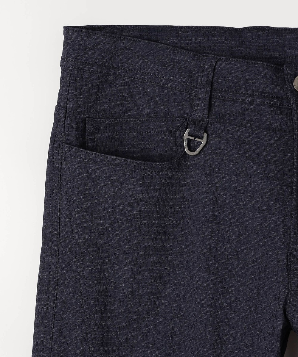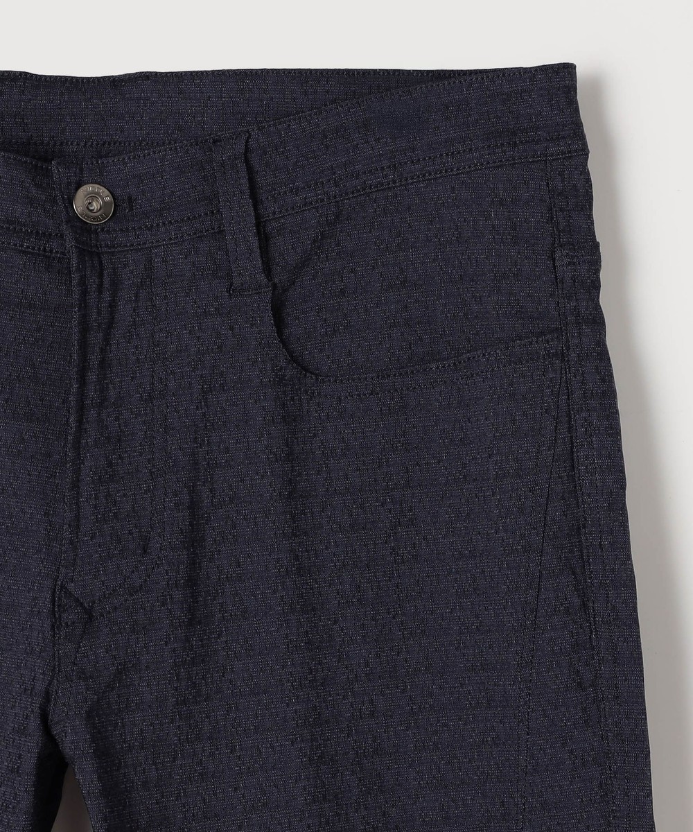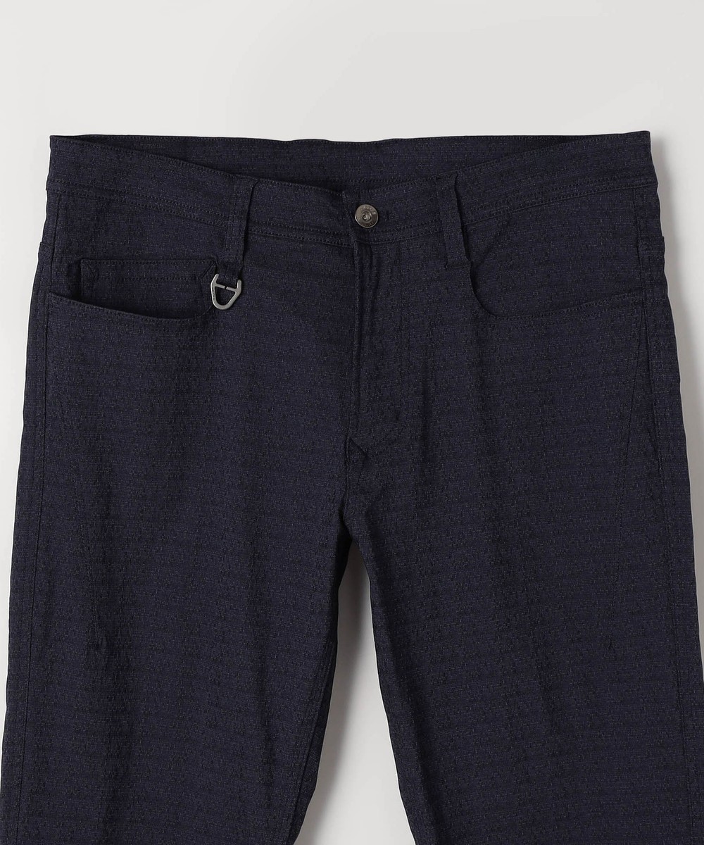 シンプルな5ポケットパンツです。ウエストベルトを素材にあわせて少し伸びる様に縫製し別布にストレッチ裏地を使用していますので穿き着心地も抜群です。フロントボタン、Dカンにはブランドロゴを使用する事で高級感を出しています。