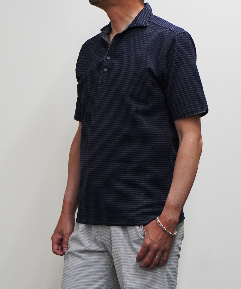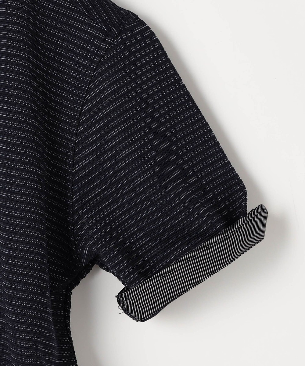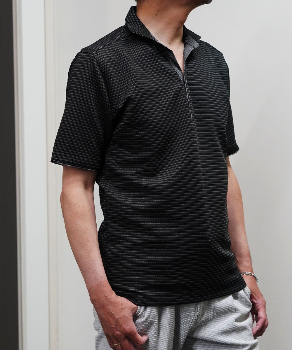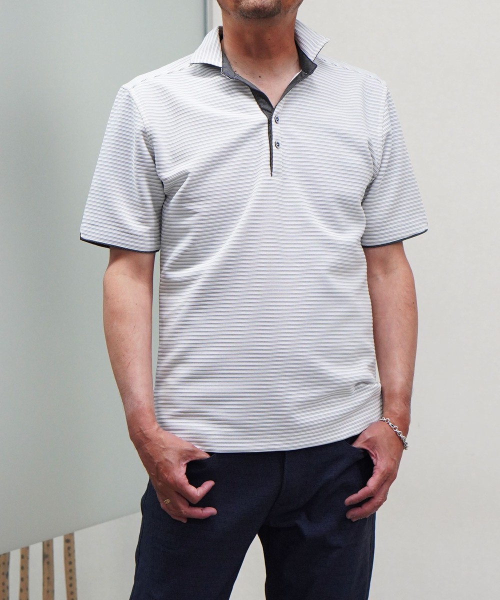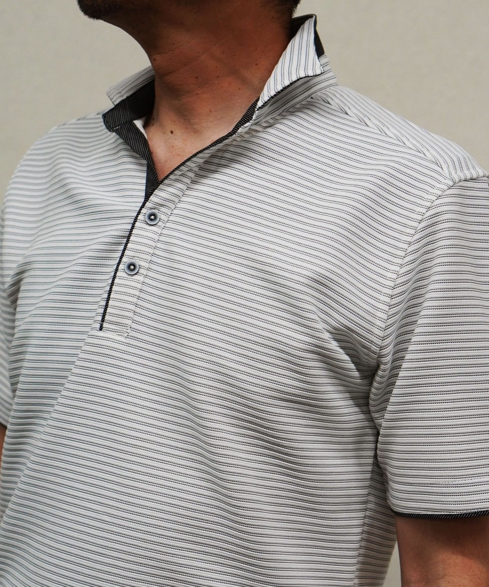 張りのある素材感でスポーティに着こなせるスキッパーポロ。要所の別生地にはピンストライプ柄浮薄素材を使い上品なギミックを随所に配した大人なポロシャツとなっています。
