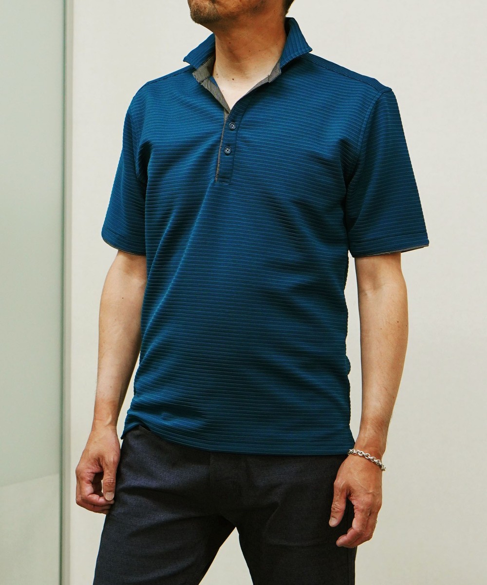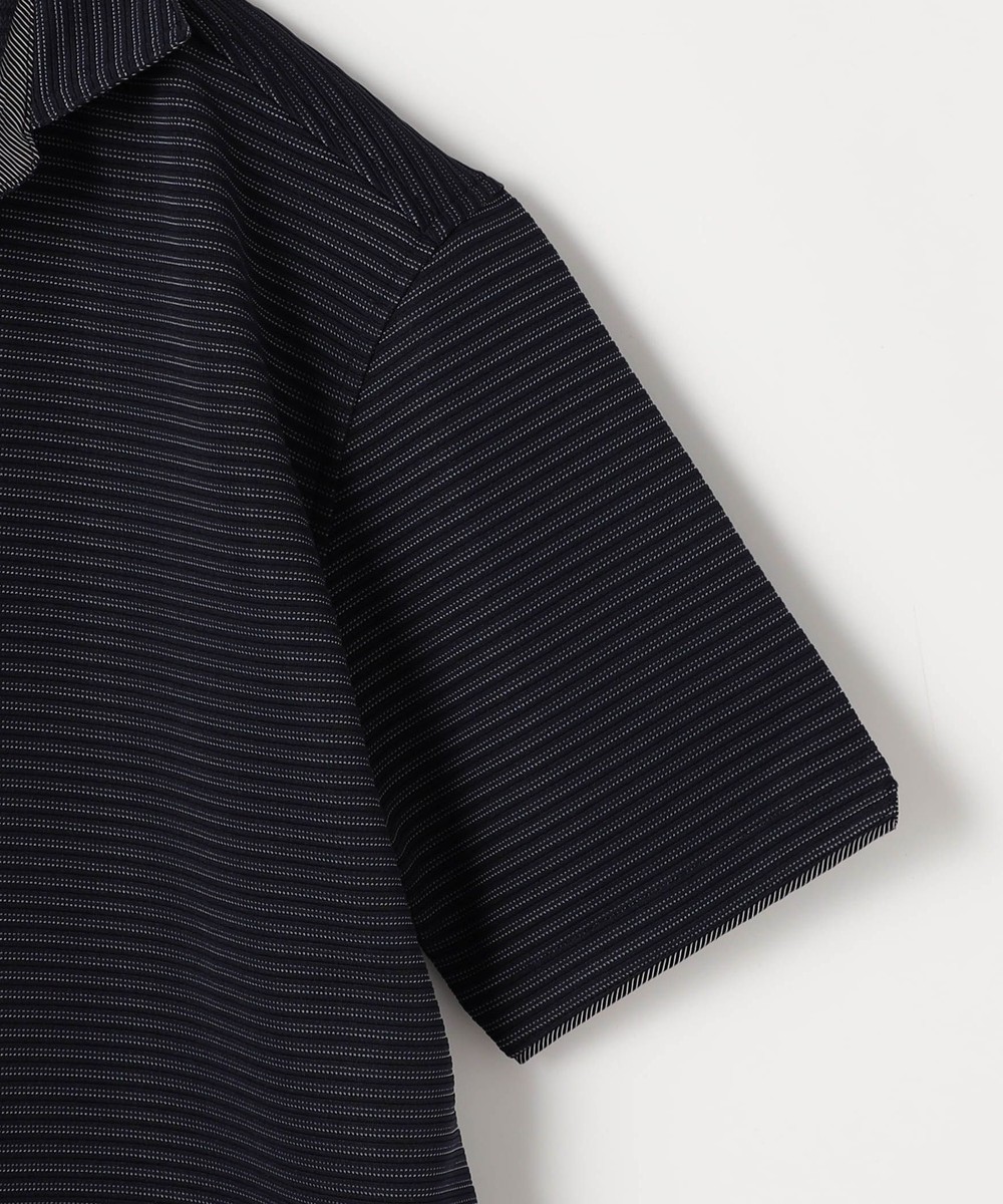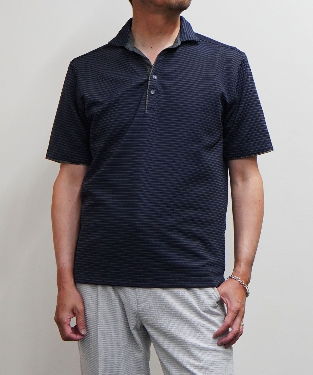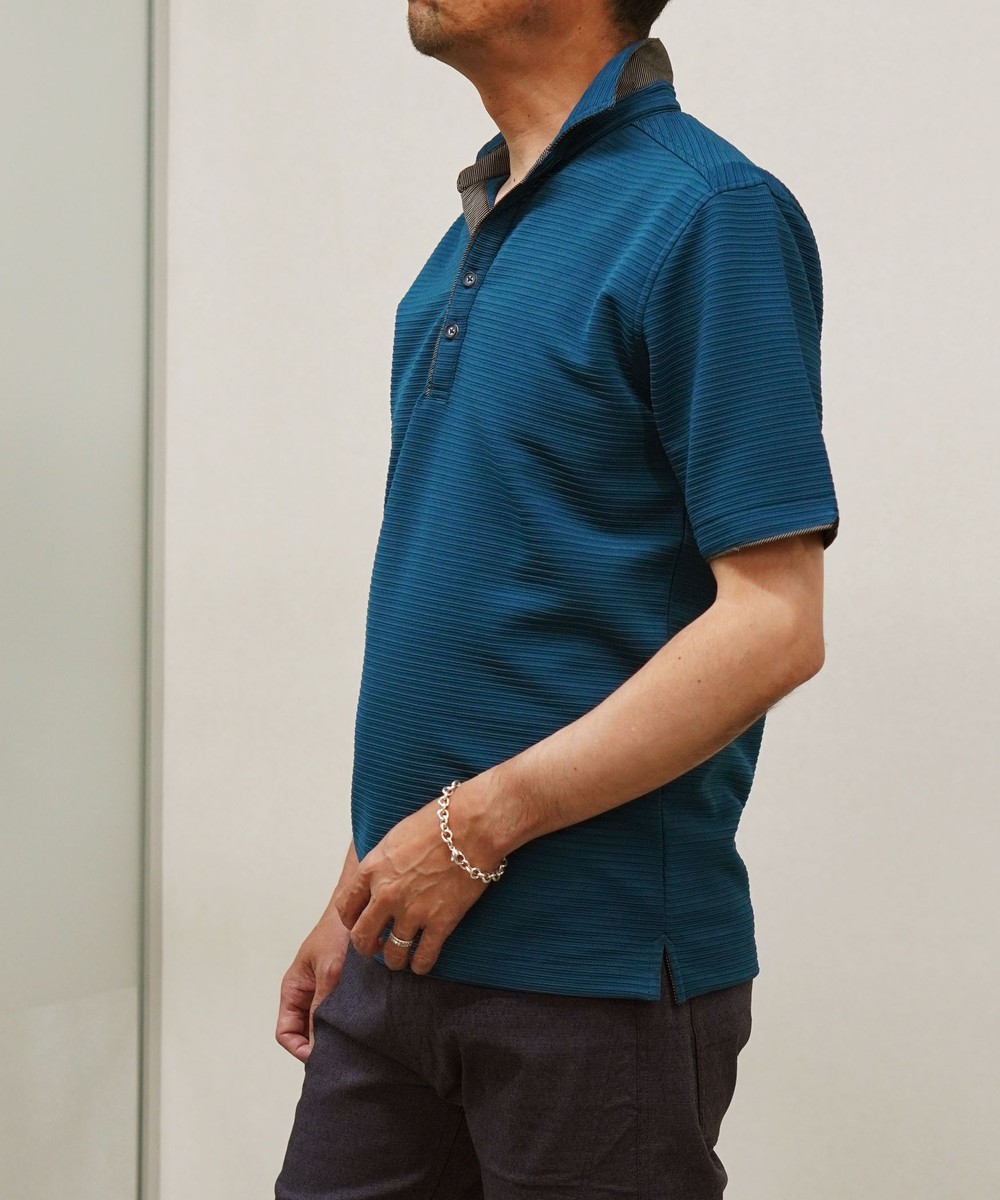 張りのある素材感でスポーティに着こなせるスキッパーポロ。要所の別生地にはピンストライプ柄浮薄素材を使い上品なギミックを随所に配した大人なポロシャツとなっています。