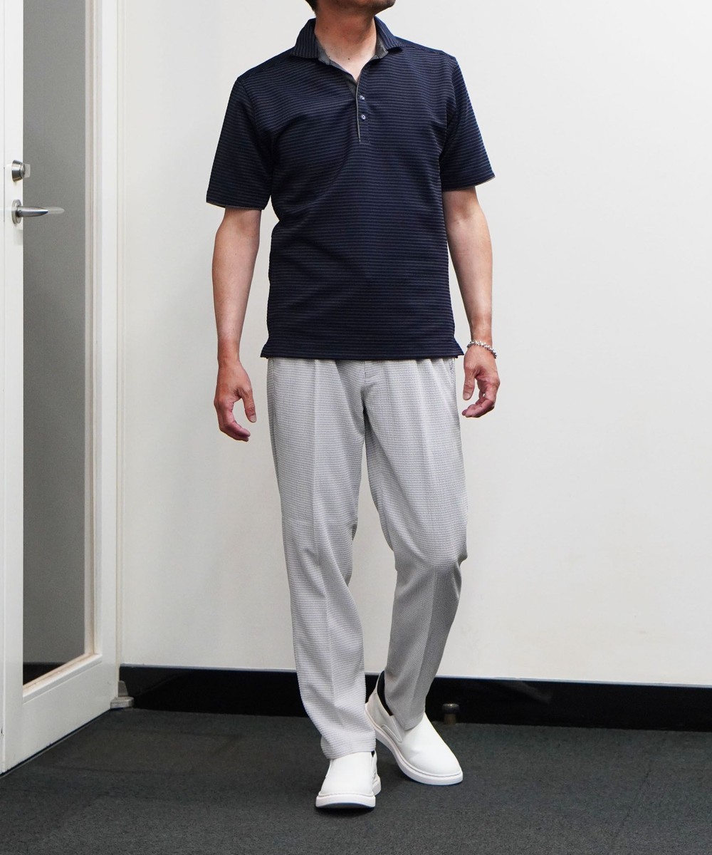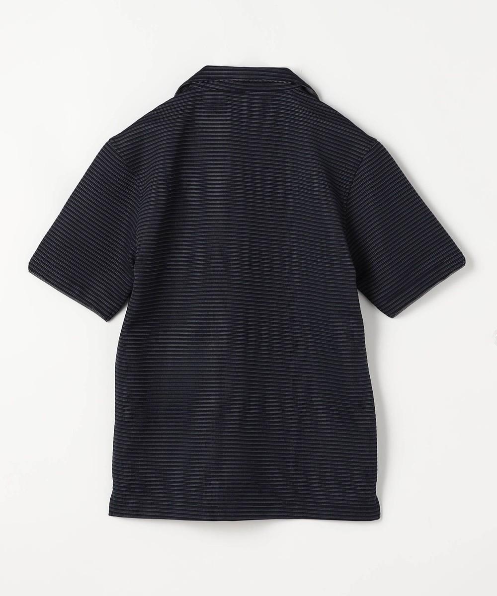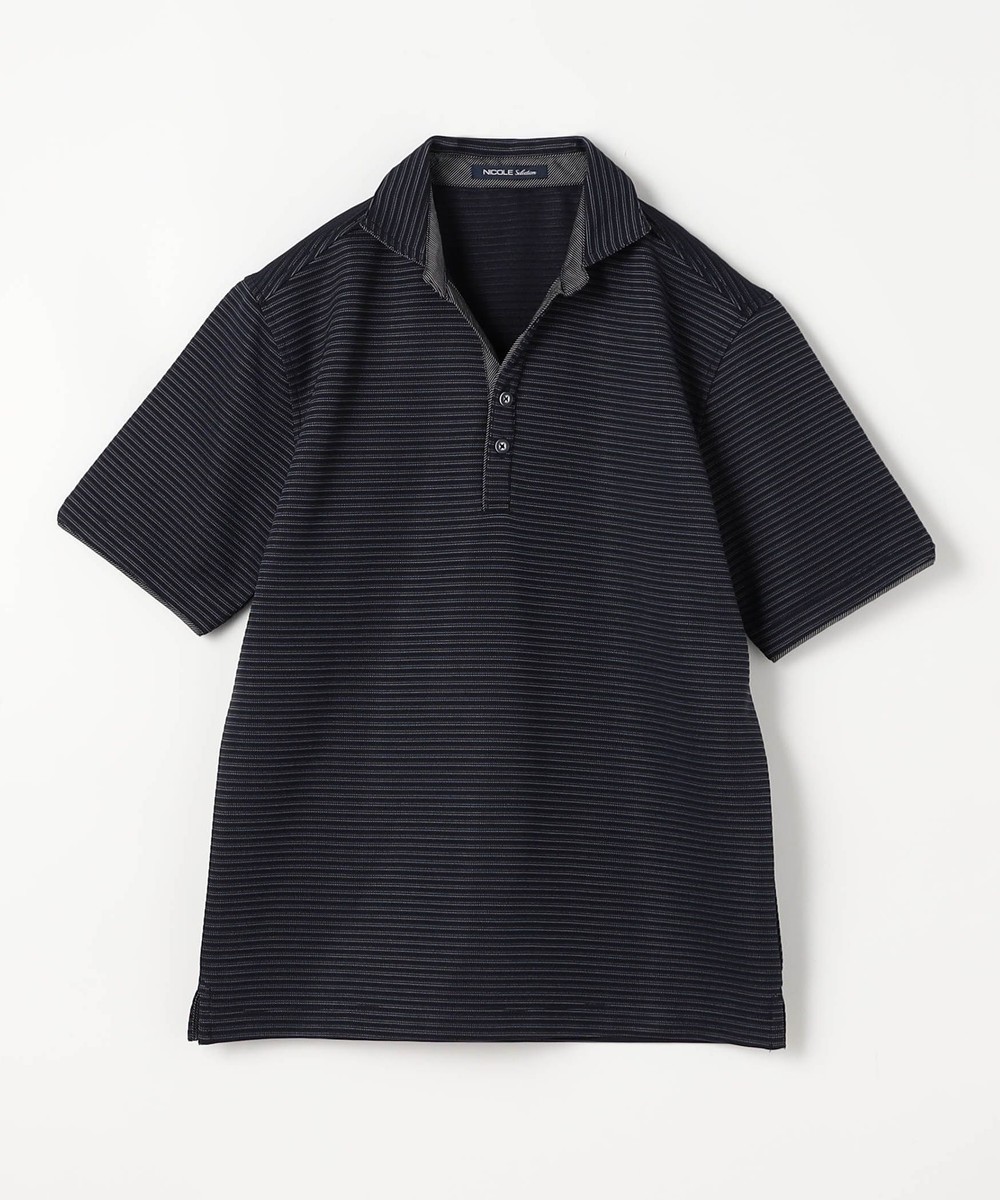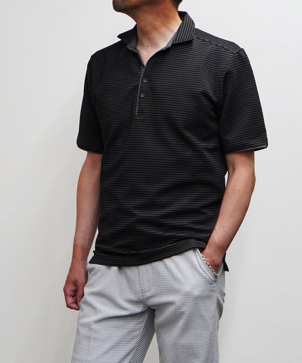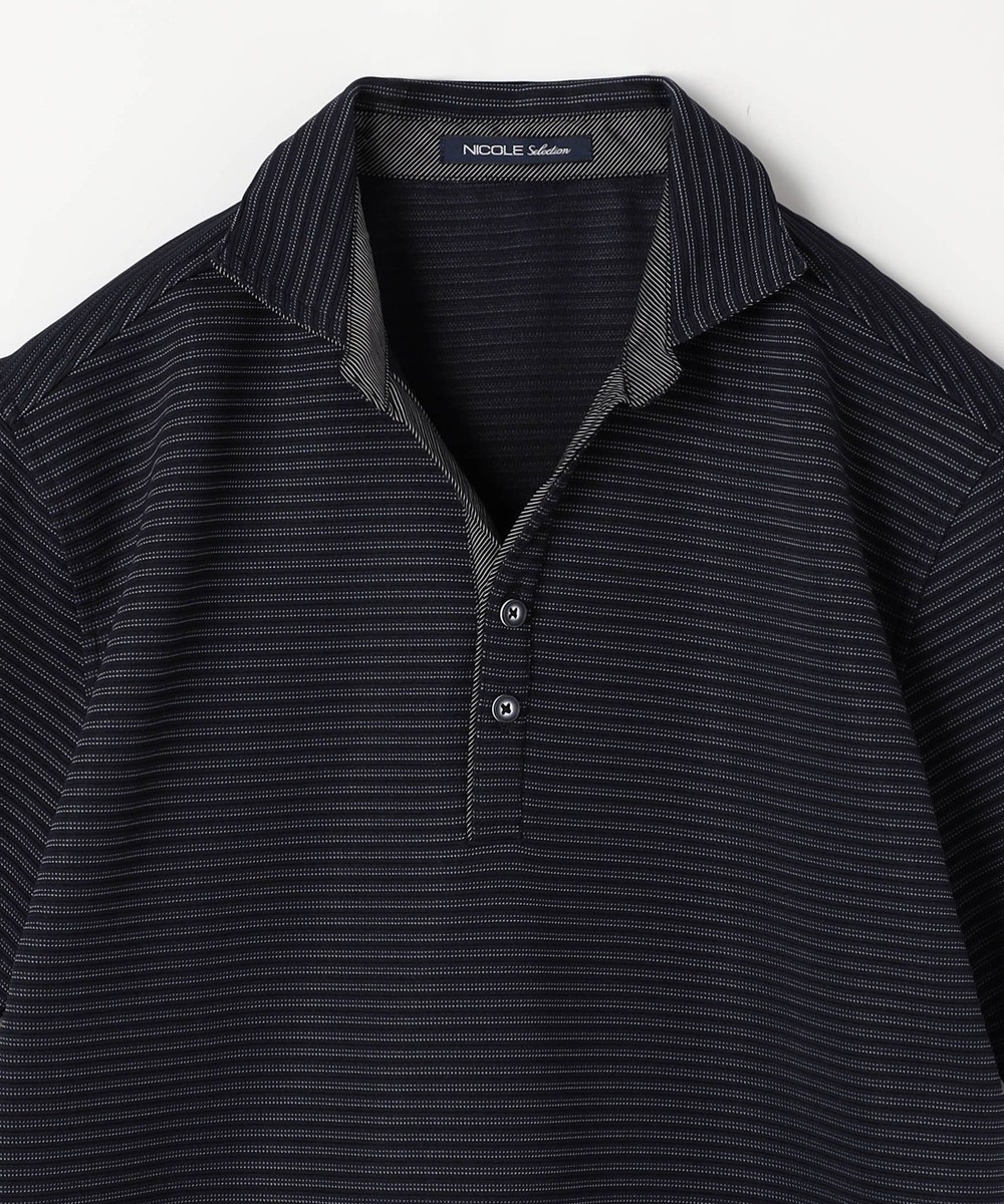 張りのある素材感でスポーティに着こなせるスキッパーポロ。要所の別生地にはピンストライプ柄浮薄素材を使い上品なギミックを随所に配した大人なポロシャツとなっています。