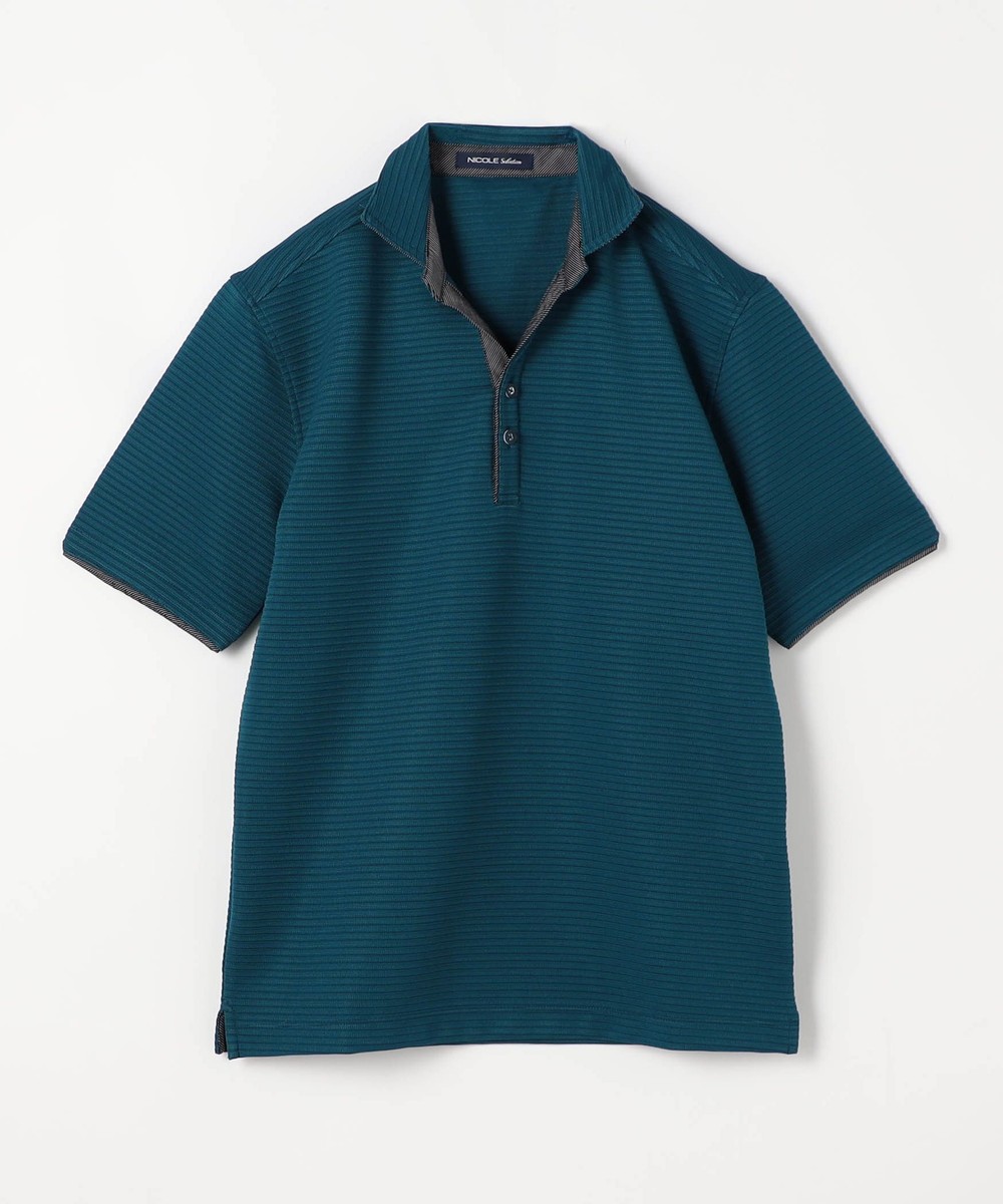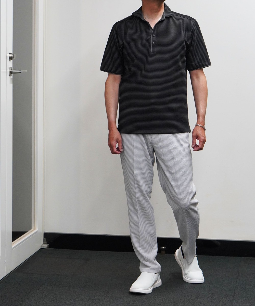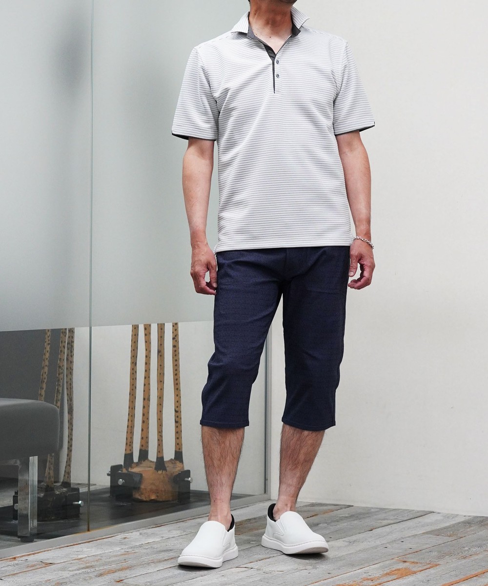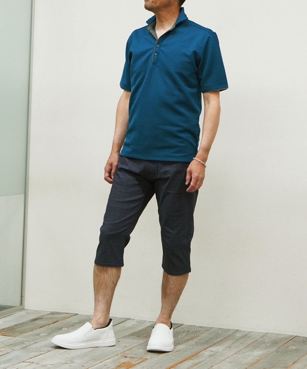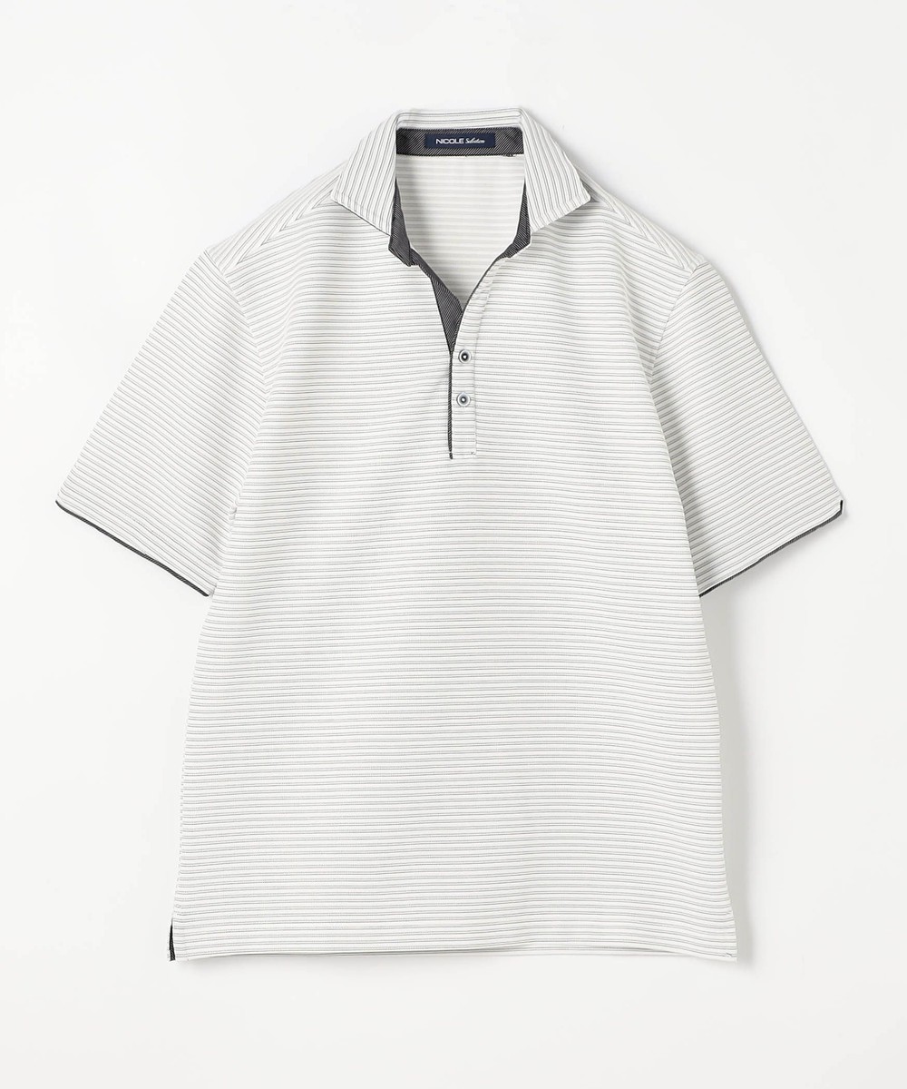 張りのある素材感でスポーティに着こなせるスキッパーポロ。要所の別生地にはピンストライプ柄浮薄素材を使い上品なギミックを随所に配した大人なポロシャツとなっています。