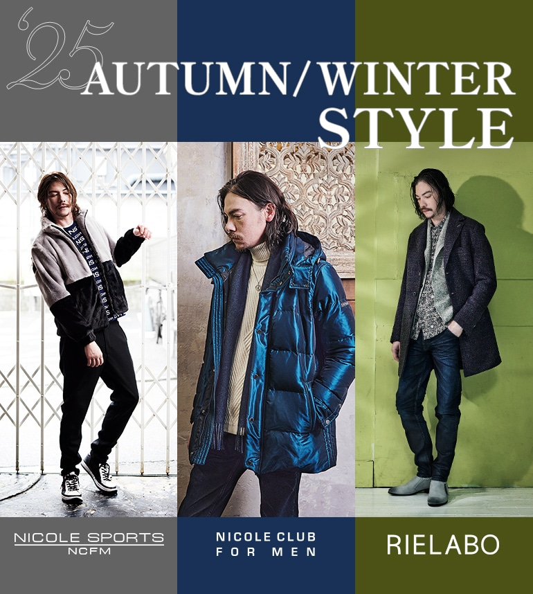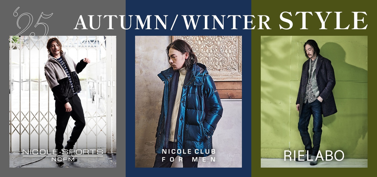 インパクトのあるシャイニーな素材のハイグレードダウン。メタリックなイメージが男っぽさを引き立て、冬らしいソフトなカラーイメージのスタイリングで上品な印象に着こなします。